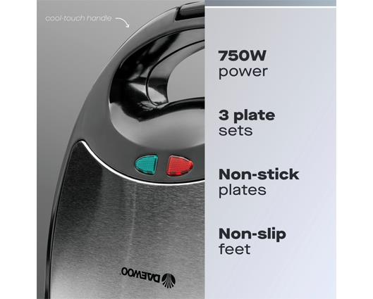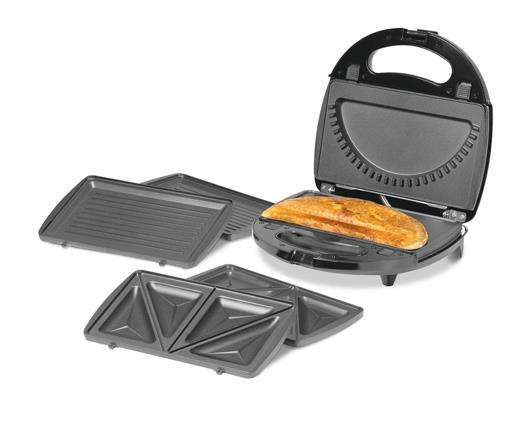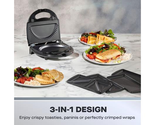 Your Ultimate Guilt-Free Snacking Solution Say goodbye to kitchen clutter and hello to delicious versatility with the 3-in-1 Sandwich, Panini, Crimp Maker. Whether you�re craving a classic toastie, a golden panini, or a perfectly crimped wrap, this multi-functional appliance does it all - all while encouraging healthier eating with less oil. 3 Interchangeable Plates for Endless Possibilities Switch up your snacks with ease! This 3-in-1 Snack Maker comes with three unique cooking plates: sandwich plates for gooey, golden toasties, panini plates for caf�-style grilled sandwiches, and crimp plates to seal in your ingredients for mess-free wraps. It�s like having three appliances in one compact design, saving you space while offering endless possibilities. Healthier Snacking, Made Simple Enjoy your favourite snacks with less guilt. The 3-in-1 Snack Maker uses significantly less oil than traditional methods, making it ideal for healthier lifestyles. Whether it�s a buttery toastie or a crispy grilled panini, you can savour every bite without compromise. Mess-Free Cooking and Effortless Cleaning The non-stick plates make food release a breeze, keeping your snacks intact and making clean-up hassle-free. With removable plates, cleaning up after your cooking endeavour is quick and easy, letting you focus on enjoying your creations. Safety First, Always The cool-touch handle allows you to safely lift the lid during use, even while the plates are hot. Plus, the power and ready light indicators take the guesswork out of cooking, letting you know when the appliance is preheated and ready to go. Peace of Mind Your purchase is protected with an extended 3-year warranty (upon online registration), giving you confidence in the durability and performance of your 3-in-1 Sandwich, Panini, Crimp Maker. Cook with ease, knowing your appliance is built to last!