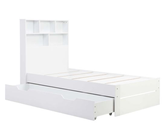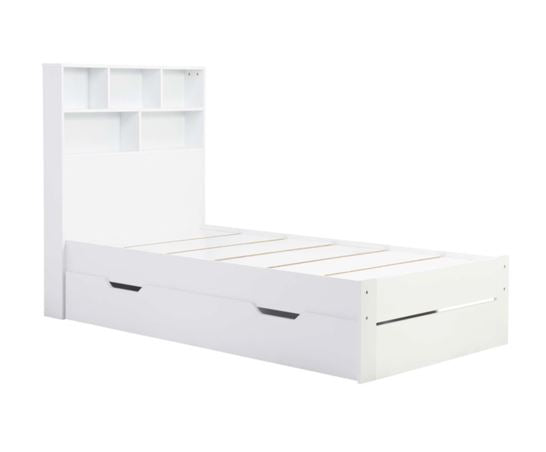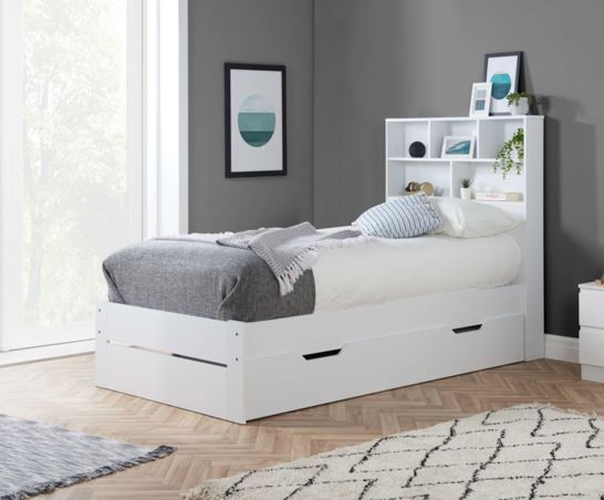 The Alfie storage bed is a versatile bed like no other. The Alfie comes with a headboard storage solution ideal for books, blankets and other trinkets. The Alfie storage bed also has a useful pull out drawer that can be used either side of the bed .Please note: beds are only suitable for a UK standard size mattress.