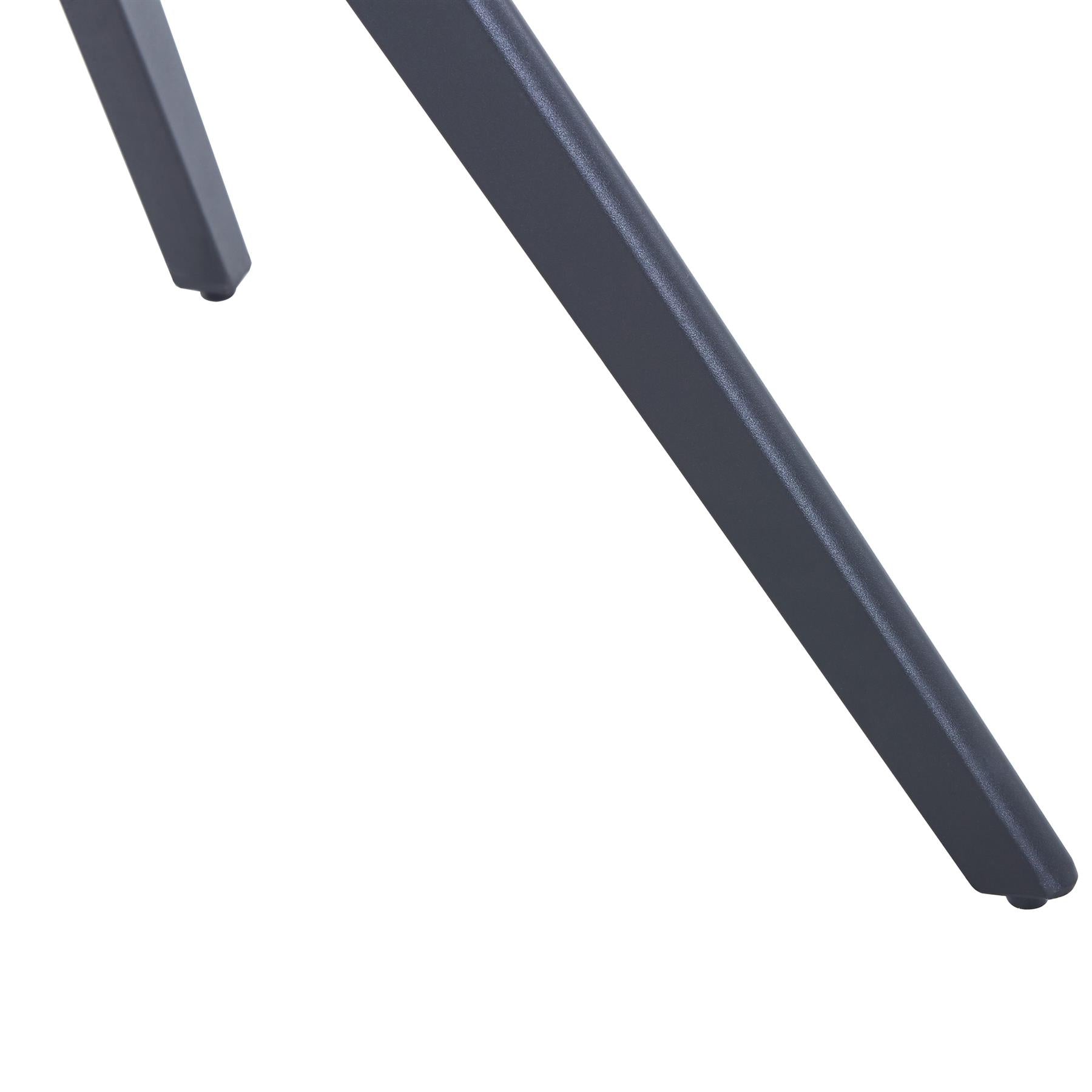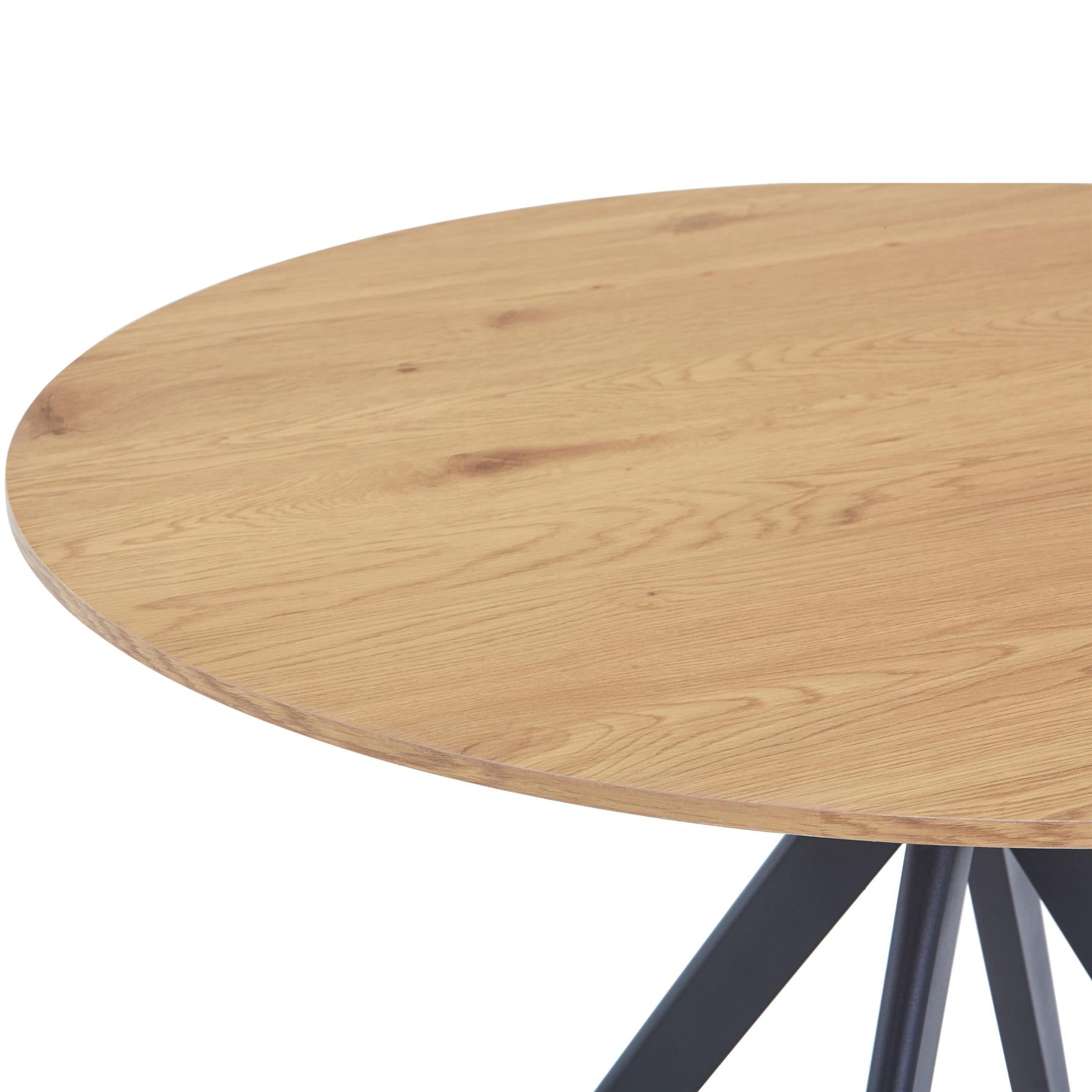 Our Aspen compact Oak woodgrain effect round dining table features a gently tapered shape and soft edge design. The table top sits on a metal centre pedestal base formed of 4 tapered legs with a black matt paint and built in adjusters for uneven floors. Can comfortably seat 4 depending on your chair selection.