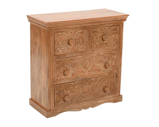 Solid mango wood handcrafted spacious chest of drawers. Exquisite craftsmanship with detailed carving, handmade entirely using 100% eco sourced natural wood. The intricate hand carved artwork detailing on this chest of drawers makes this item a real eye-catcher and will add a touch of elegance to your home. Featuring 2 large drawers and 2 smaller ones there is plenty of storage space available for anything you choose to use it for. Will be great in the bedroom or equally suitable for the lounge. Display lamps, photos or any other accessories to the top of the unit to add to the beauty of this item. Handmade entirely using 100% Eco sourced solid natural wood by skilled craftsmen in India. This range is finished in a light whitewash for a distressed look.
