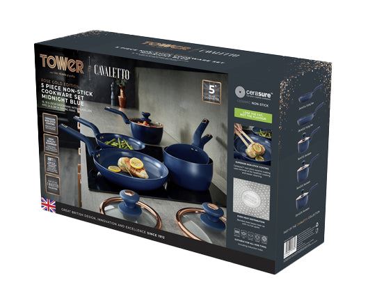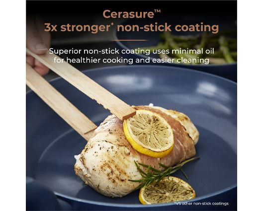 Consists of 16/18/20cm saucepans with 24/28cm non-stick frying pansConstructed from high quality pressed aluminiumNon-stick Cerasure ceramic coated interiorHeat resistant colour matching exteriorColour matching soft touch bakelite handle with hanging loopBonded steel base for even heat distributionSuitable for all hob types including inductionHandwash only / Not suitable for oven or grill use