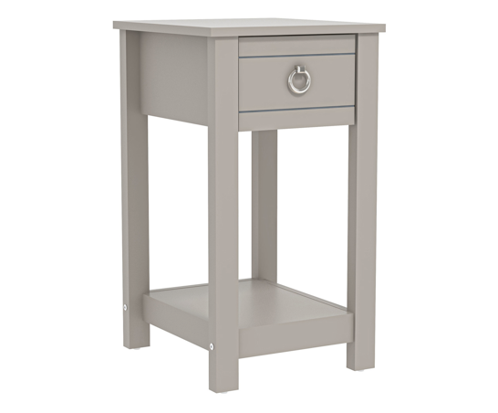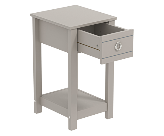 The Clover Light Grey 1 Drawer Bedside Table has an efficient design from long-lasting engineered wood. It functions as a bedside and end table and has a thin drawer. Place beside couches in the living room or the bedroom to contain tissues, beverages, keys, phones, chargers, books, and periodicals. This bedside table with drawer is the ideal size to comfortably contain all of your needs, accessories, and toiletries, keeping them near by, at the ready. It measures