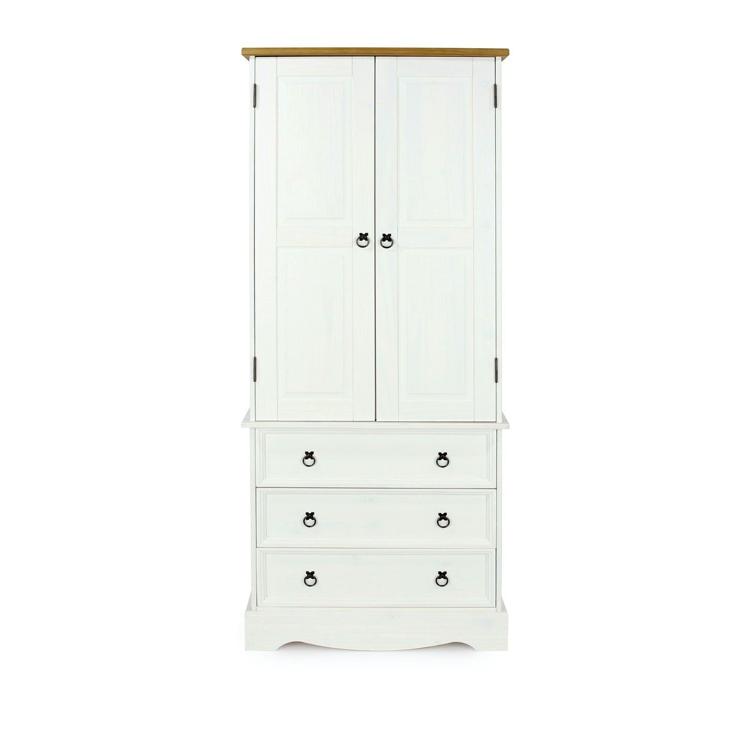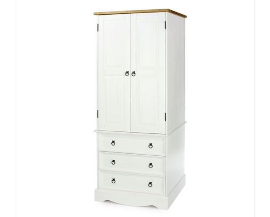 Combining 3 drawer storage and 2 door hanging space all into one compact width wardrobe finished in white wax with antique wax top.