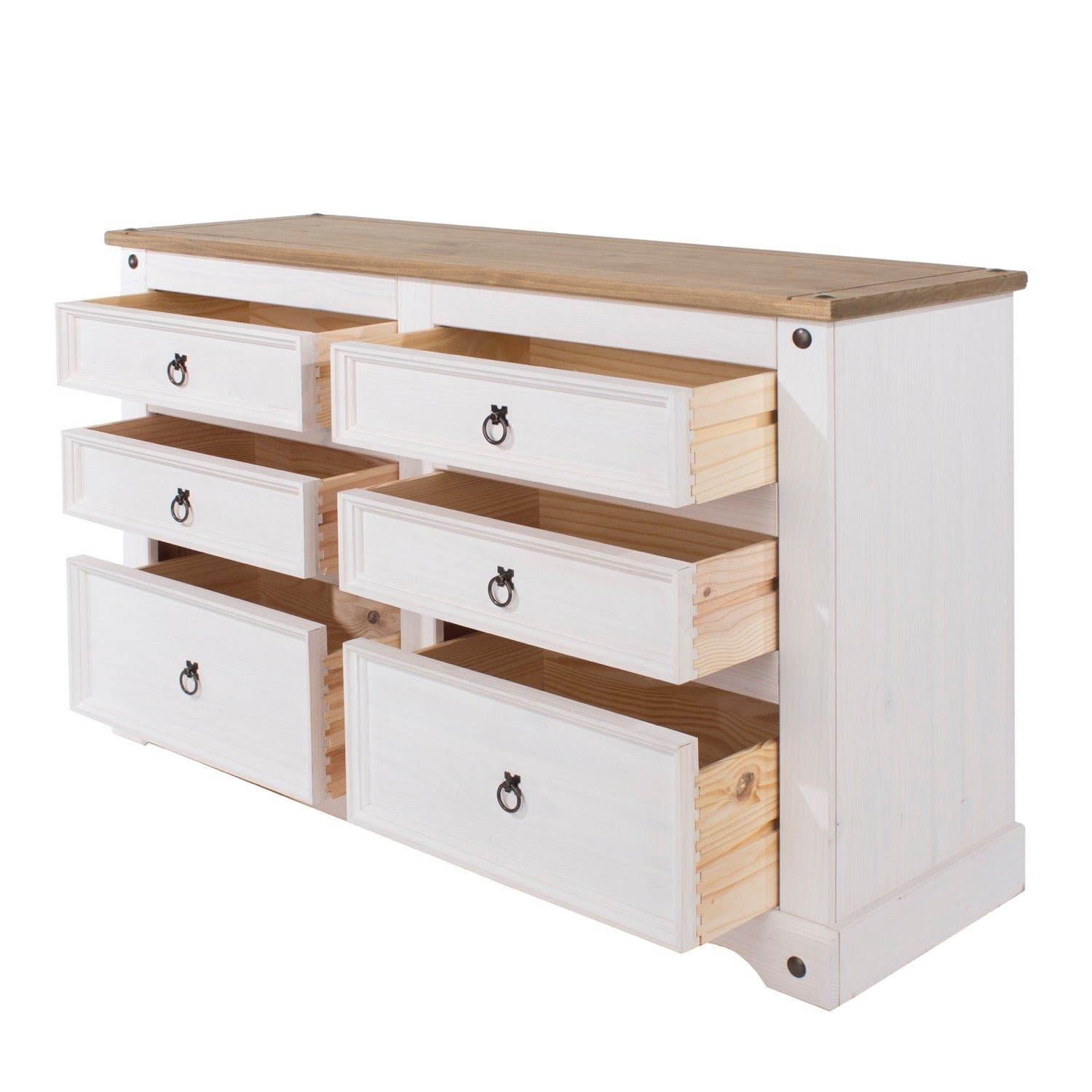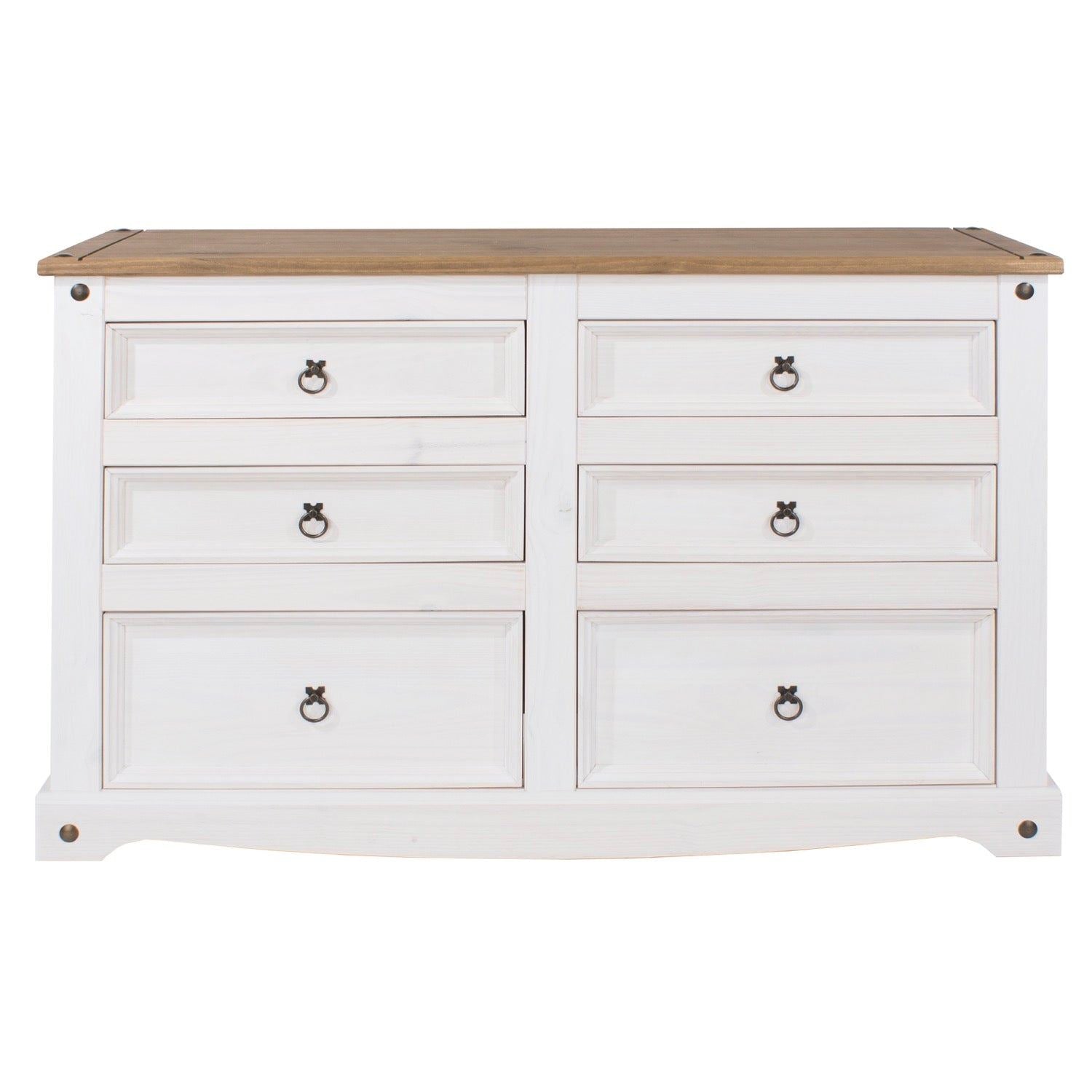 This 3+3 drawer wide chest offers loads of useful storage combined with a fashionable antique and white wax finish with black metal hardware.