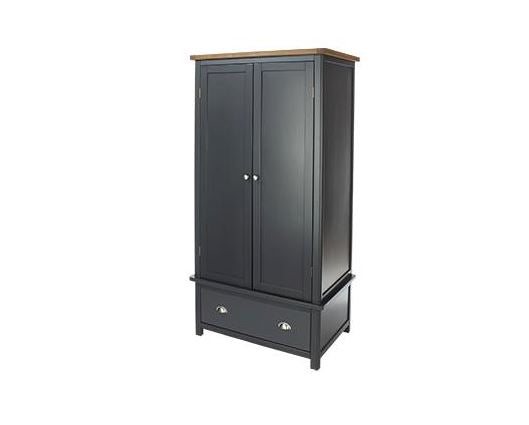 Traditionally constructed, handcrafted 2 door wardrobe with 1 deep drawer in base, finished in a midnight blue paint and rich antique stain finish embellished with real metal handles.