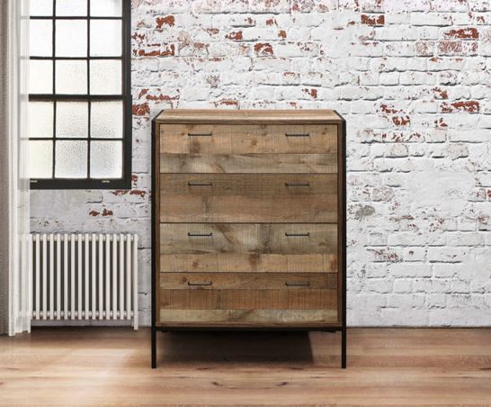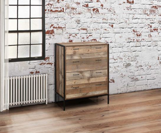 Our Urban bedroom range is perfect for adding a hint of industrial chic to any bedroom. The Urban 4 Drawer Chest is designed with four spacious drawers and is ideal for storing away any belongings. This versatile range is crafted from a metal frame with industrial-effect detail and has a wood-effect finish. Care instructions: Wipe carefully with a soft, dry cloth.