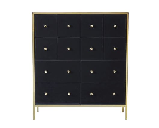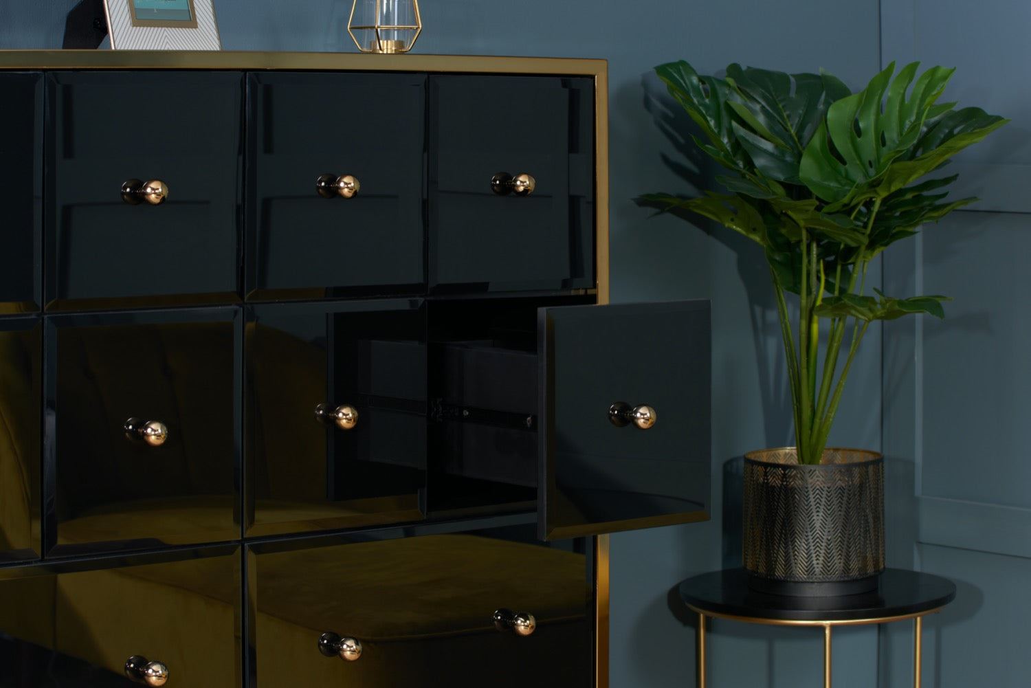 Our Fenwick range exudes glamour, charm and luxury. At home in any classic room, this stunning design demands attention thanks to its bevelled glass black panels and stunning gold frame. The Fenwick merchant chest features 4 spacious drawers and 8 smaller drawers providing plenty of storage space. This range is certainly eye catching and guaranteed to be suitable for most stores, showroom and online stores. Cleaning and Care: Wipe with dry cloth.