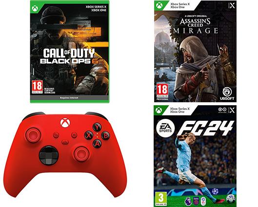 This great bundle includes a wireless controller in Pulse Red and a copy of Call of Duty Black Ops 6, Assassin's Creed Mirage, and EA Sports FC 24 all for the Xbox Series X.
