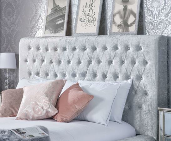The Grande ambassador bed exuberates a majestic and royal aura with its beautifully diamond buttoned headboard, upholstered side panels and footboard to match. The Grande features a stunning crushed velvet fabric that is a standout piece of furniture in any bedroom. The Grande bed frame is upholstered in polyester with silver feet and comes in a beautiful crushed steel velvet. This frame has a sprung slatted base sunken into the bed that offers a natural bounce, adjusting to where pressure is most exerted to provide greater comfort. The maximum weight load for the 4'6ft frame is 300kg, the 5ft frame is 400 kg, 6ft frame is 450 kg. Please note: beds are only suitable for a UK standard size mattress and the recommended mattress height is 3400mm.
