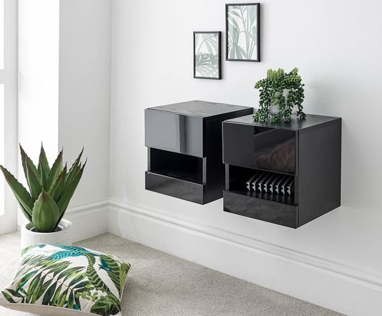 Keep things simple with this stylish pair of bedside cabinets. The cuboid construction offers a practical solution to bedside storage, while the high-gloss monochrome finish is the perfect addition to your modernist, minimalist interior décor. Comprising a single cupboard with a top-hinged flap, wall-mounted Graze makes a handy base for a lamp, with ample space beneath for books, magazines and other night-time accessories. Available in a choice of white, black or grey with the option of a feature blue battery-powered LED downlight.