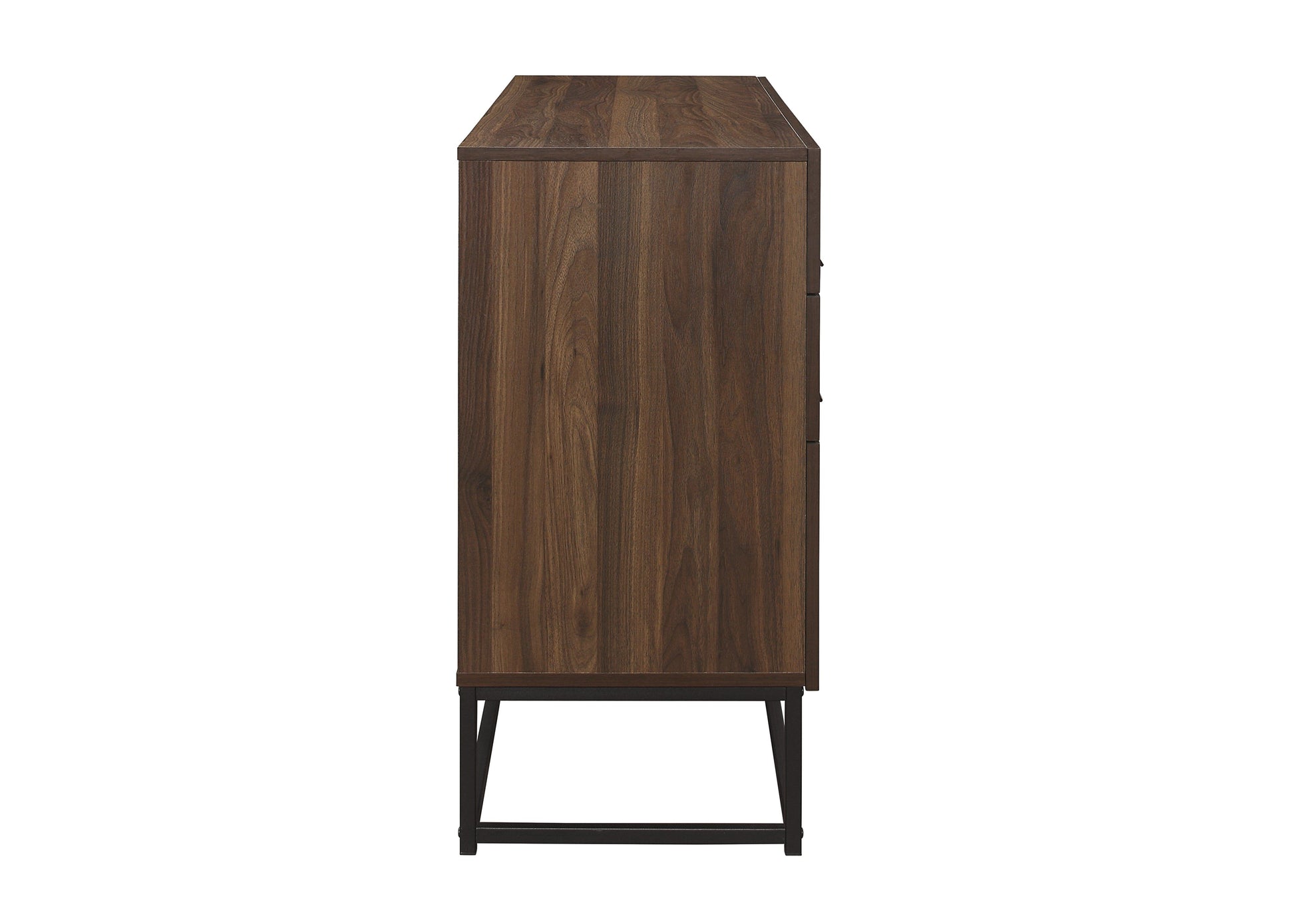 Crafted from a mix of metal and walnut effect wood, the Houston distinctive, modern style oozes sophistication inspired by modern architecture. The Houston 6 Drawer Chest is designed with four spacious drawers and is ideal for storing away any belongings. This versatile range is crafted from particle board with walnut effect finish. Care instructions: Wipe carefully with a soft, dry cloth.