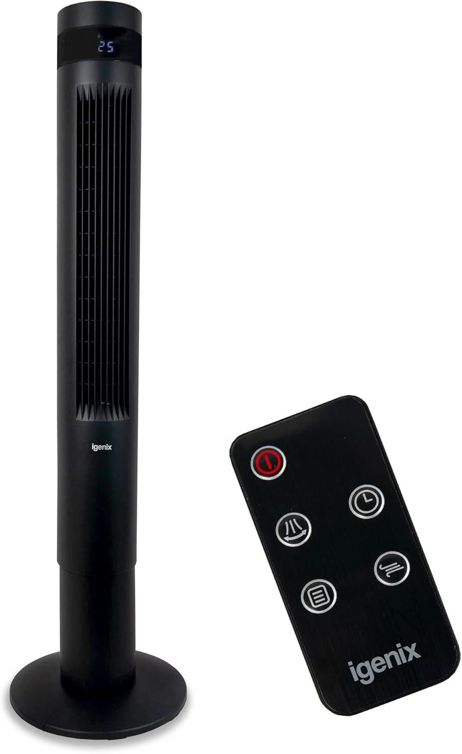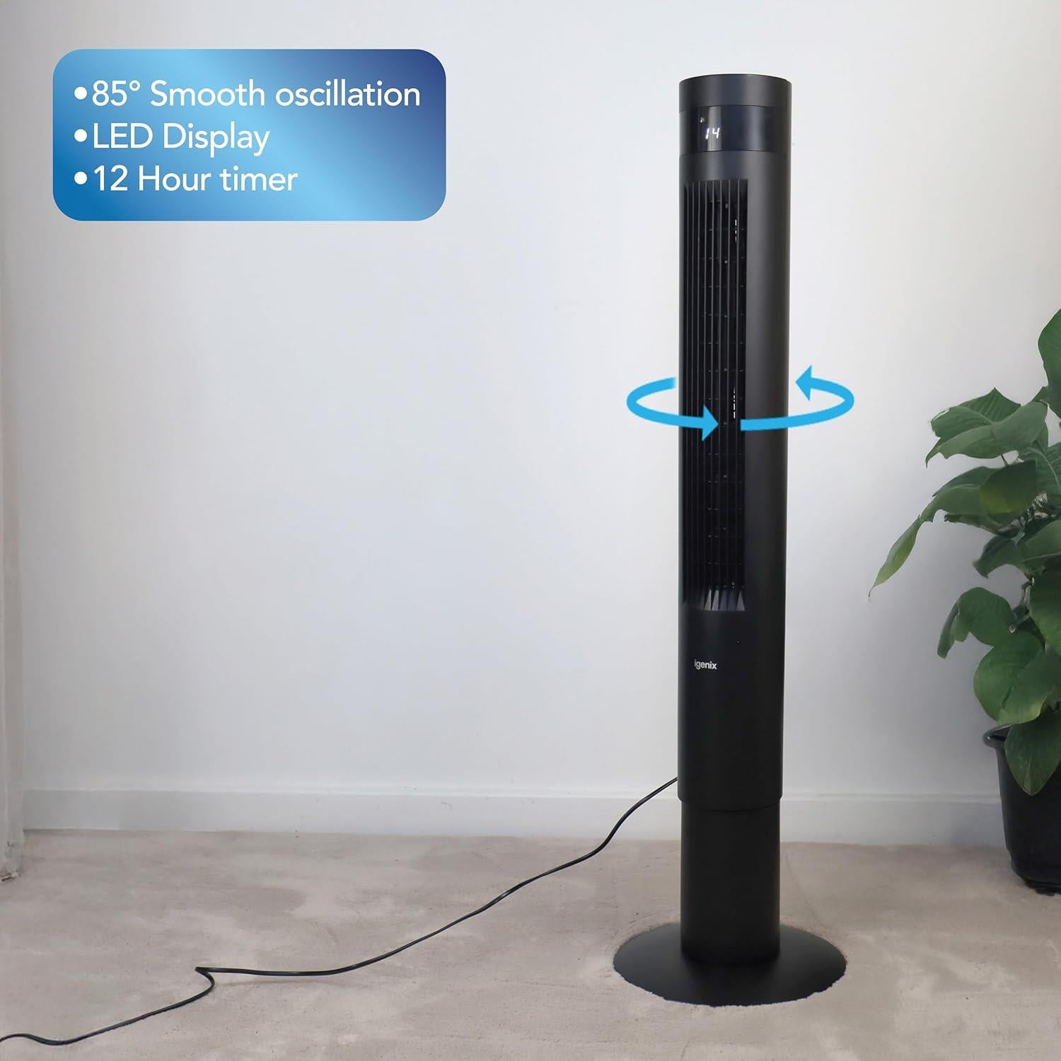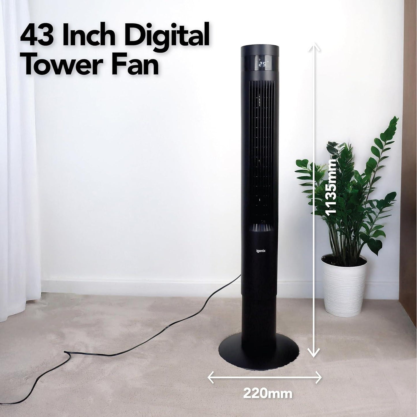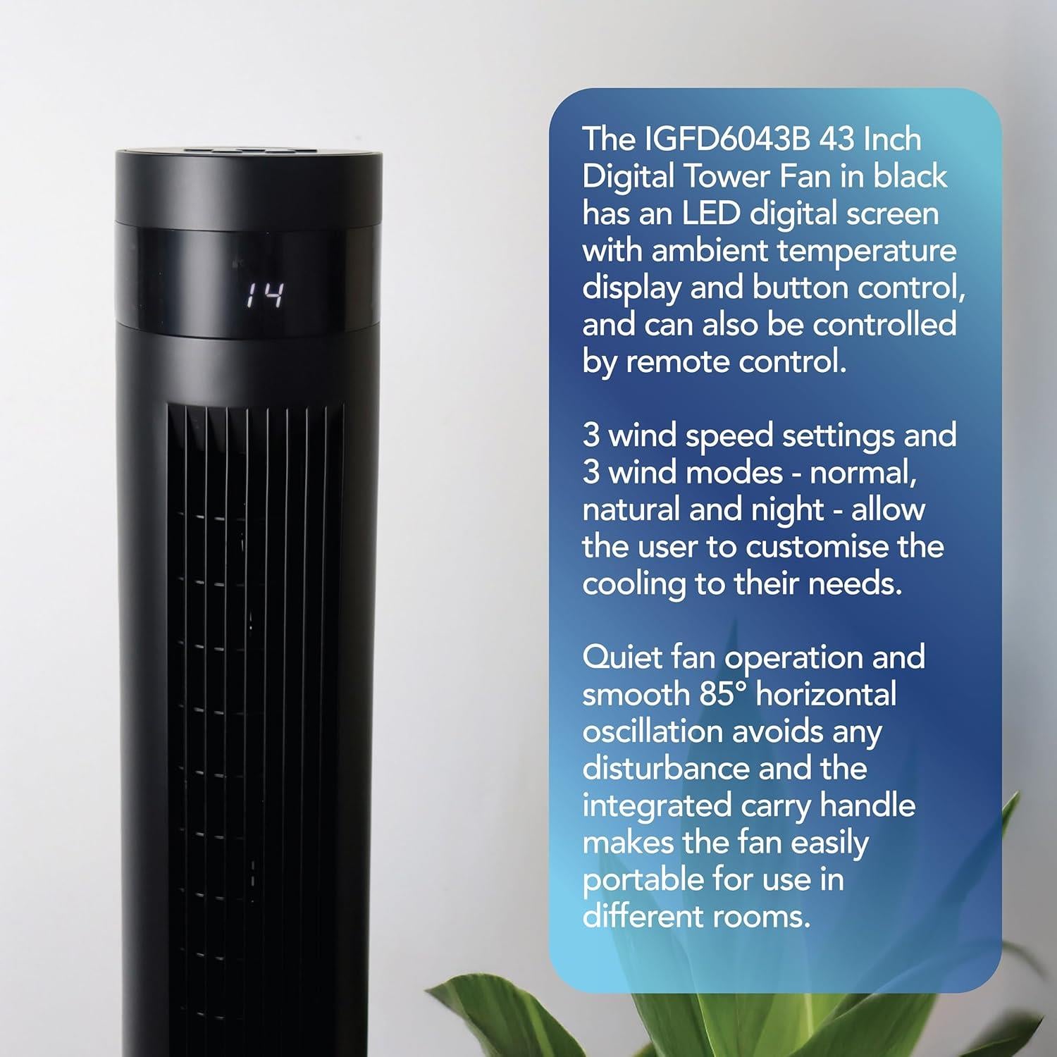 Igenix IGFD6043B Oscillating Digital Tower Fan 43 Inch Remote Control 12 Hour Timer 3 wind speed settings Touch button control Floor Standing for Home & Office Black