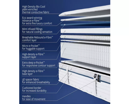 Just beneath the sleep surface is a mint enriched premium plant-enriched comfort layer. As well as having natural anti-bacterial properties the mint extract is independently tested and proven to provide a natural cooling feeling. 100% foam free and free from harmful chemicals, this mattress contains award winning Advance e-Fibre and breathable e-Fibre layers. A foundation of Deep e-Pocket springs, plus the added benefit of micro pocket springs, giving real huggable support. Vegan Friendly.