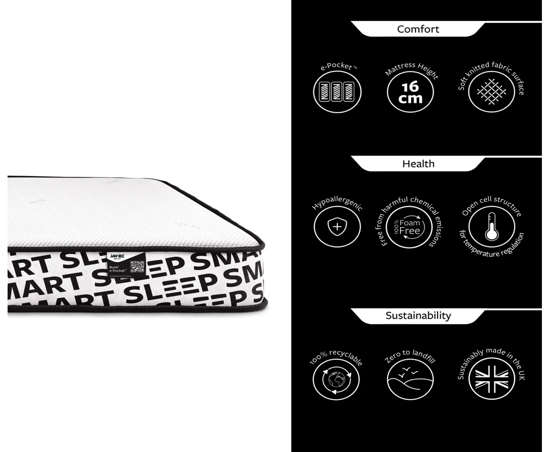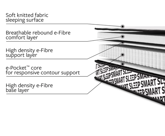 Offering the perfect blend of comfort and sustainability the mattresses e-Fibre comfort feature polyester fibres created from a minimum of 65% recycled plastic bottles and the mattress is fully recyclable at end of life.