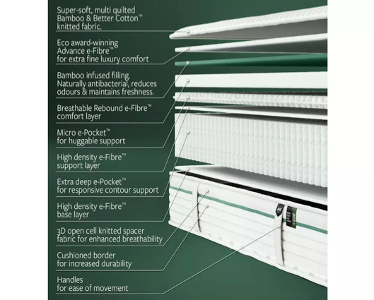 It's smooth surface reduces friction and irritation, making it suitable for individuals with allergies, eczema, or other skin sensitivities. Bamboo kun naturally inhibits the growth of odour-causing bacteria, to help keep your mattress fresh. 100% foam free and free from harmful chemicals, this mattress contains award winning Advance e-Fibre and has a foundation of Deep e-Pocket springs, plus the added benefit of micro pocket springs, giving real huggable support. Vegan Friendly.