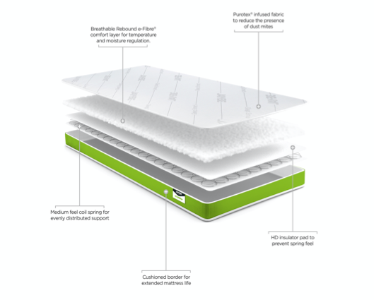 Purotex® treated. A 100% natural probiotic technology which absorbs moisture and reduces the presence of dust-mite allergens. 100% Foam Free comfort layers, free from harmful VOC emissions. Sustainable eco-friendly design. Hypoallergenic and breathable for a fresher and healthier sleep. Breathable Rebound e-Fibre comfort layers for temperature and moisture regulation. Sprung interior for evenly distributed posture support. Easy care - simply rotate regularly to maximise the life of the mattress. Edge to Edge comfort layers for maximum sleeping area. Made in the UK to British and European safety standards. Suitable for 2+ years. Not for use in cots.