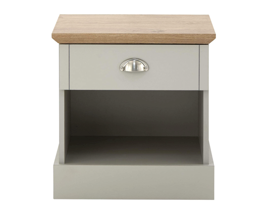 Upgrade your bedroom furniture with classy Kinsley . This smart bedside table will suit any classic or contemporary interior scheme, uniting a soft grey painted base with a bevelled oak-effect top to stylish effect. The unit incorporates a neat top drawer, complete with brushed steel cup handle and features an open shelf that makes a great repository for books and other nightstand essentials.