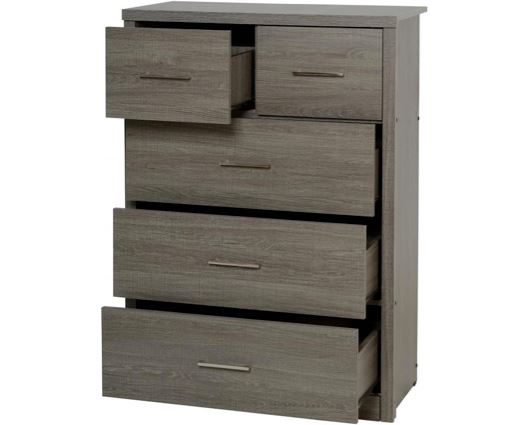A lovely modern design in a vast range of pieces. Available in 2 finishes, Black wood grain effect and Light Oak effect. The range has metal handles, metal drawer runners and metal hinges. Made from veneered composite board and MDF. This Chest has 3 deep full size drawers and 2 half size drawers for smaller items.