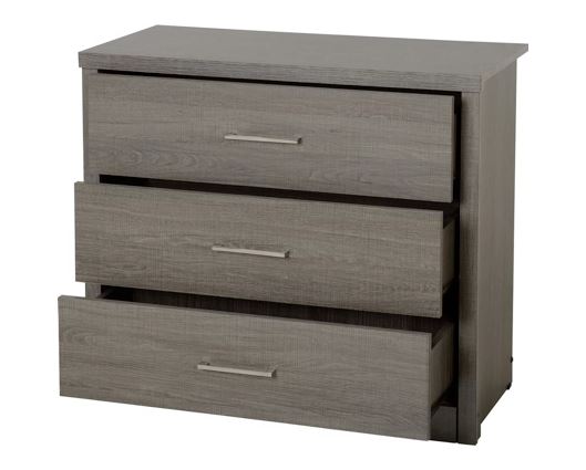 A lovely modern design in a vast range of pieces. Available in 2 finishes, Black wood grain effect and Light Oak effect. The range has metal handles, metal drawer runners and metal hinges. Made from veneered composite board and MDF. This Chest has 3 spacious drawers.