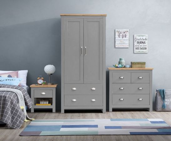 Full of presence, the Lincoln range in Light Grey and cascading Oak tops fills any room with warmth and comfort. This bedroom set consists of a 2 door double wardrobe, chest of 2+2 drawers and 1 drawer bedside table.