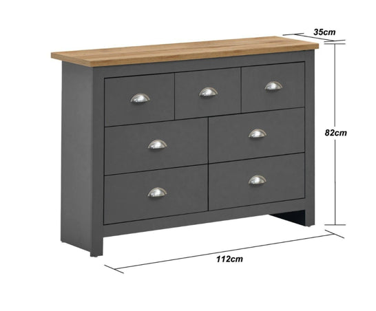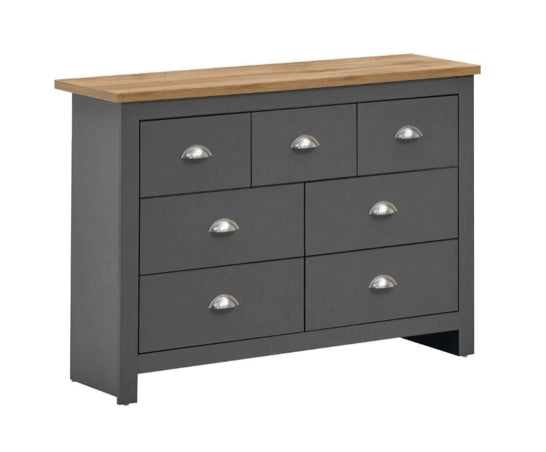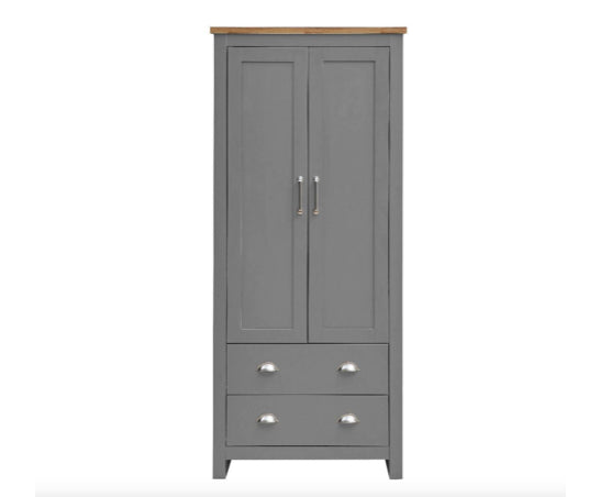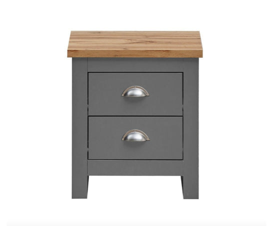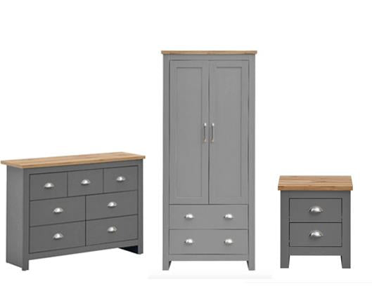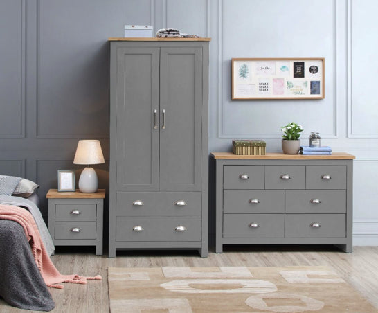 Full of presence, the Lincoln range in Light Grey and cascading Oak tops fills any room with warmth and comfort. This bedroom set consists of a 2 door double wardrobe, chest of 3+4 drawers and 2 drawer bedside table.