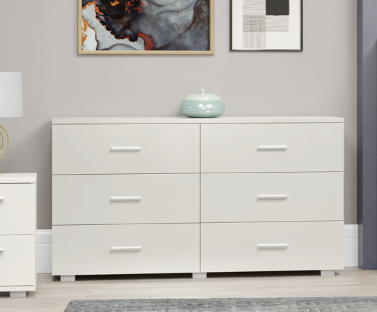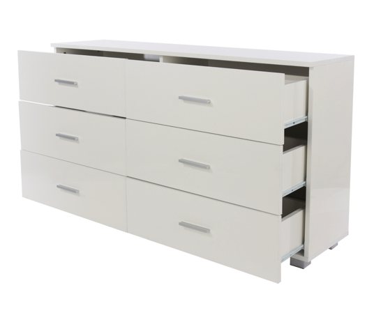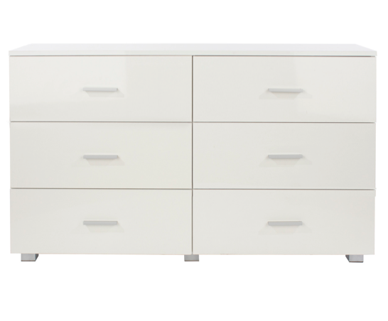 When lots of drawer space is needed our 3+3 double wide chest of drawers is ideal. It features a smooth gloss white film finish which is both hardwearing and easy to clean. Matt silver effect handles and feet complete the look whilst the easy glide drawers are ideal for everyday use.