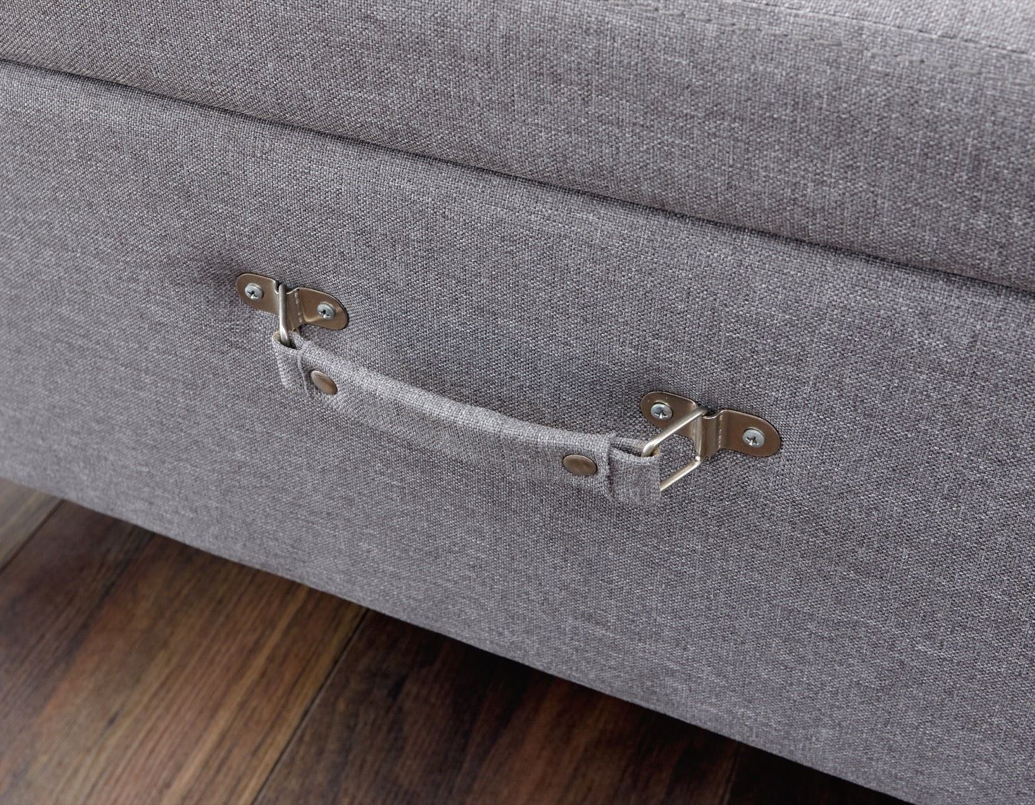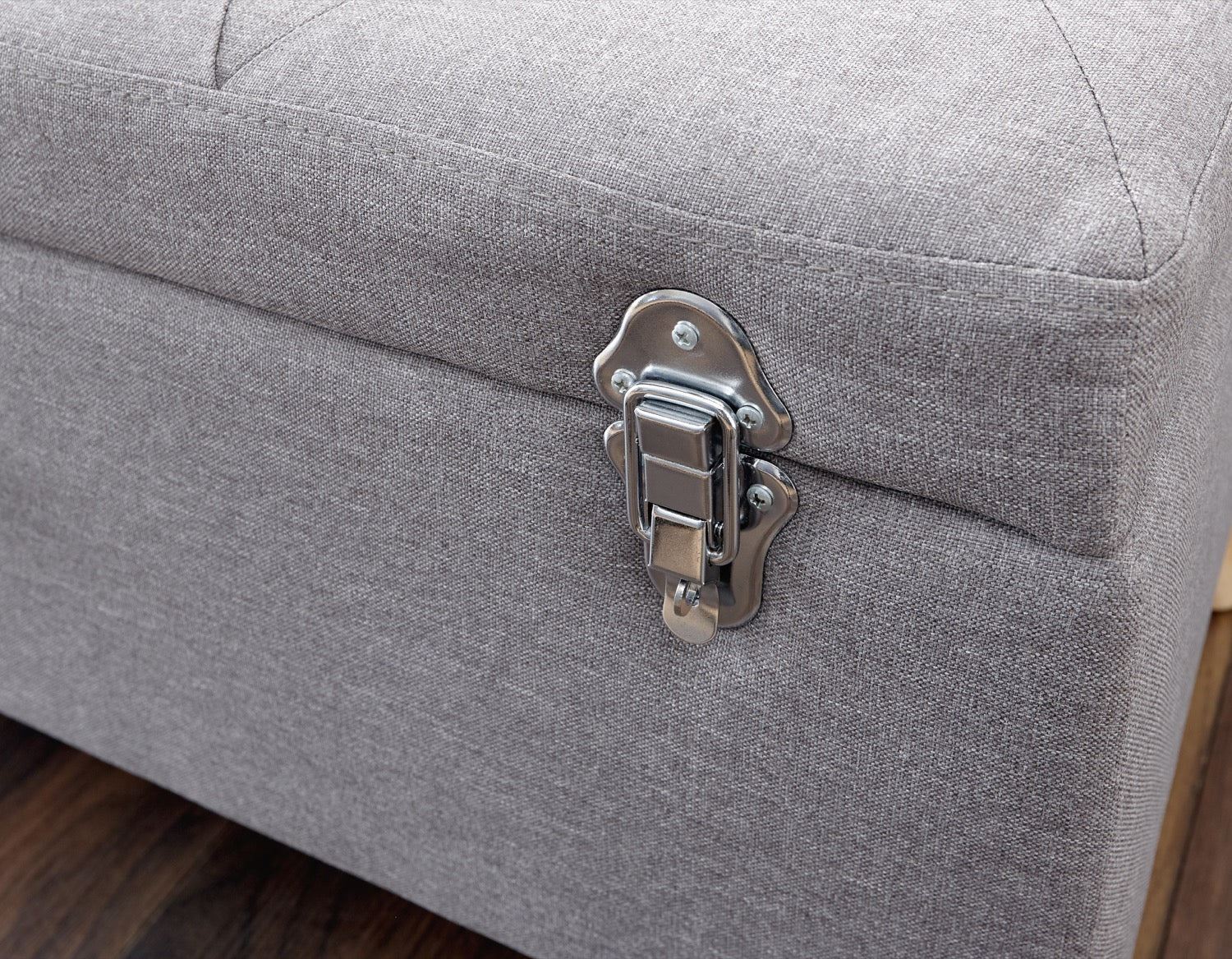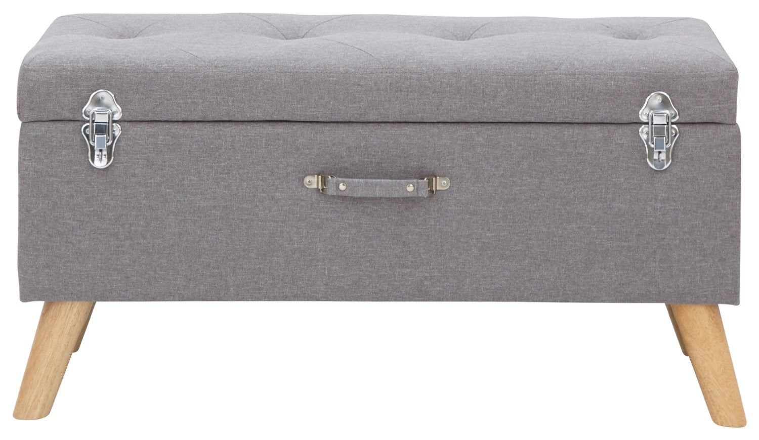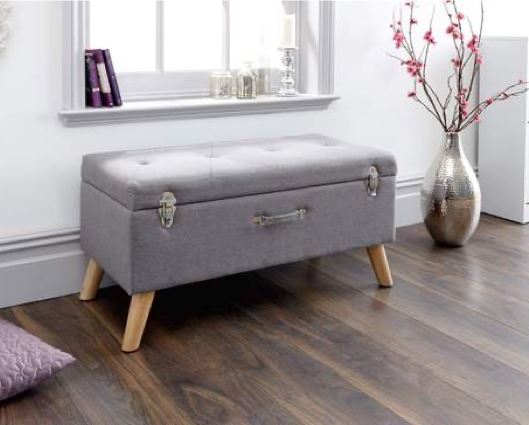 A fabulously stylish and wonderfully practical furnishing piece that deserves a place in the most discerning modern home. Maisie's design is inspired by a classic instrument carry case: the upholstered frame incorporates a diamond quilt-effect cushioned lid and features a pair of chrome hasps that open to reveal a generous storage space. The retro effect is completed by the addition of a decorative carry handle and cool angled wood legs. Available in on-trend shades of grey, as well as a striking mustard colourway.