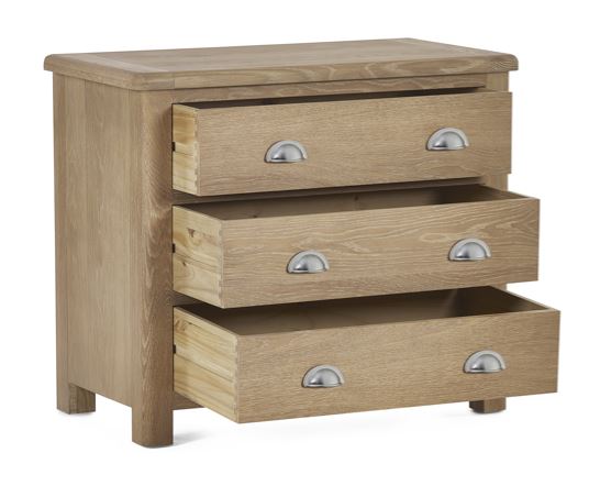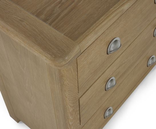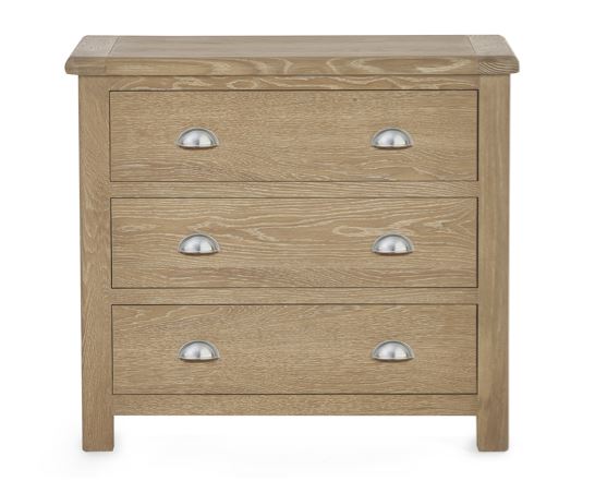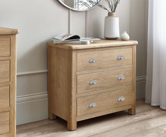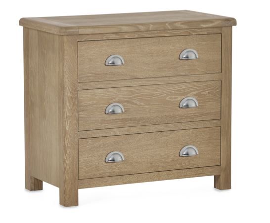 The Malani 3 Drawer Chest is finished in a gorgeous limed oak, providing a smooth curved edging that will add a timeless look to any bedroom space. This sleek design features three pull-out drawers allowing perfect ample storage space for clothing and bedding which are elegantly finished with bulbous polished silver handles.