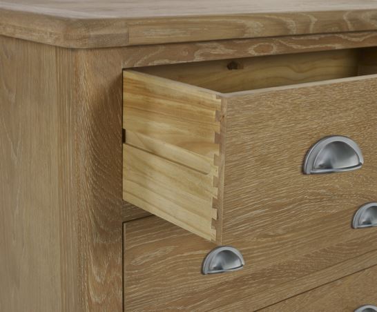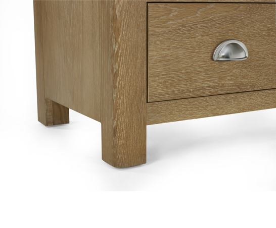 Finished in a gorgeous limed oak; Smooth curved edging; Three pull-out storage drawers; Elegantly finished with bulbous polished silver handles