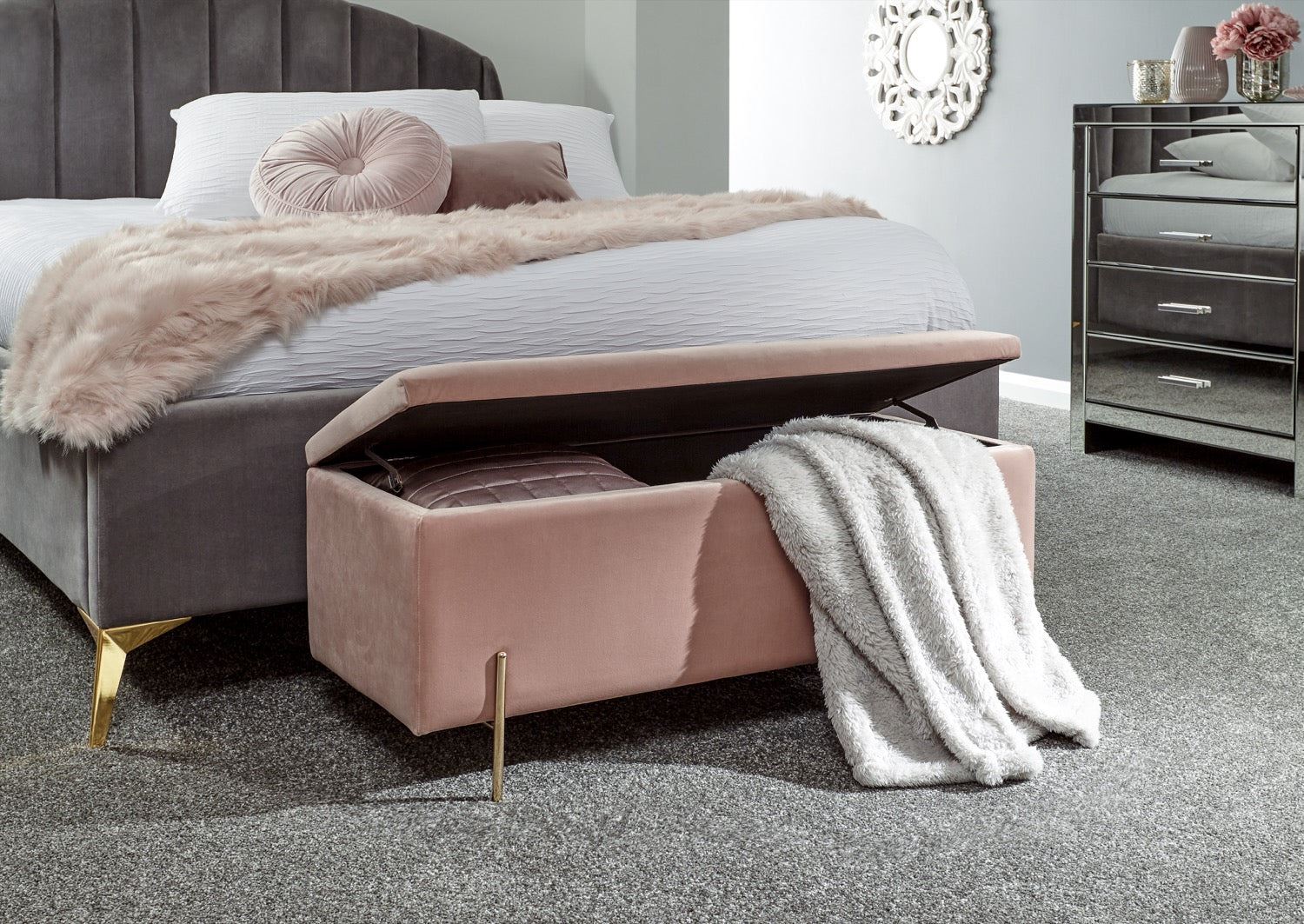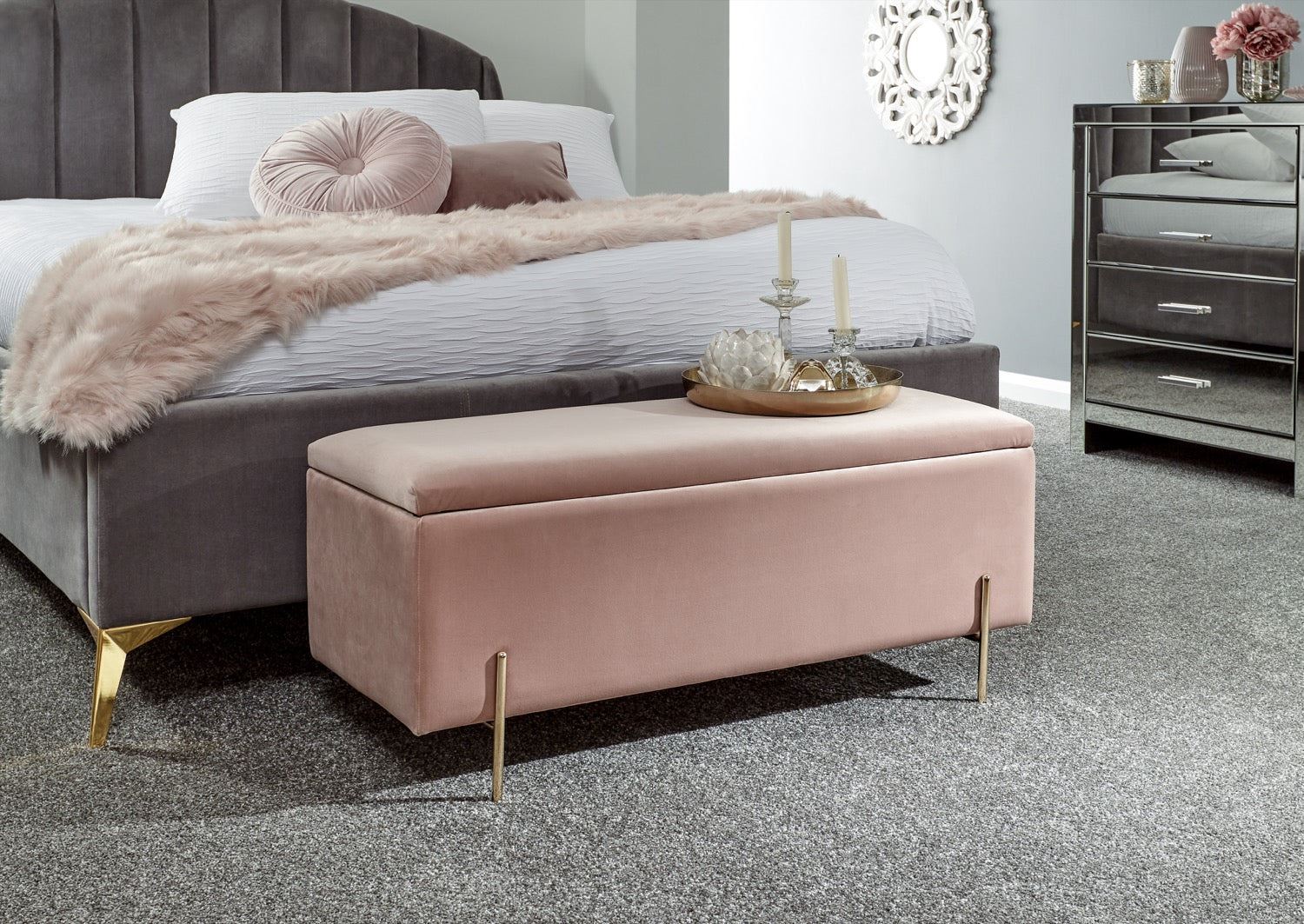 Every bedroom needs a storage box and Melta is the perfect choice. The simple design makes it a good match for most interiors – pick from a selection of in-vogue colourways to suit your style. The Melta Ottoman Storage Bench has a hinged lid and features a generous lined compartment that’s ideal for extra bedding and cushions. Both frame and seat are upholstered in a tactile plush fabric with a matt velvet pile that looks and feels indulgent. The simple gold-effect metal legs add to the minimalist look and feel.