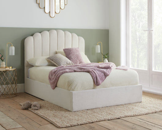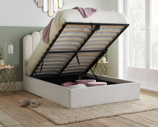 Simple, sumptuous and stylish, the Monaco ottoman bed showcases a contemporary version of the classic fan-shaped headboard, perfect for adding a modern touch to your bedroom. The Monaco ottoman bed features a unique super soft and super comfy teddy bear fabric, with the boucle fabric sure to impress. This frame has a sprung slatted base with natural bounce, adjusting to where pressure is most exerted to provide greater comfort.