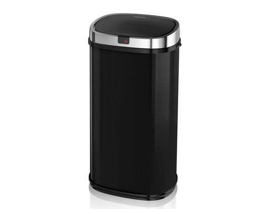 Contemporary design with sensor activated lid Steel body with non-corrosive colour coating Lid opens automatically when approached Lid closes after 5 seconds of inactivity Retainer ring allows easy replacement of bin liners Including 3 lemon scented free bin liners Size: H62.2 x W34.2 x D24.6cm (H81cm when open) Requires: 4 x AA type batteries (not included) Colour: Black Packaging type: Colour gift box