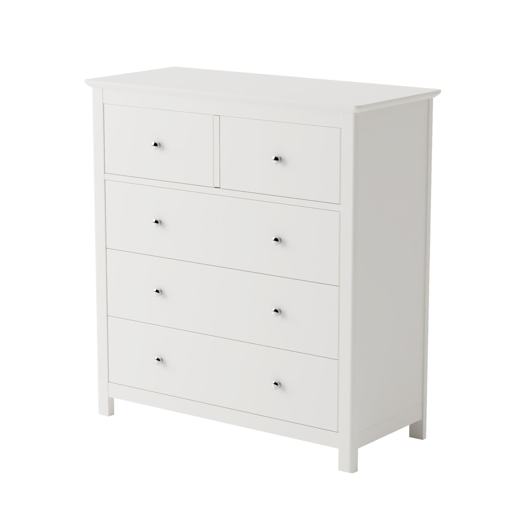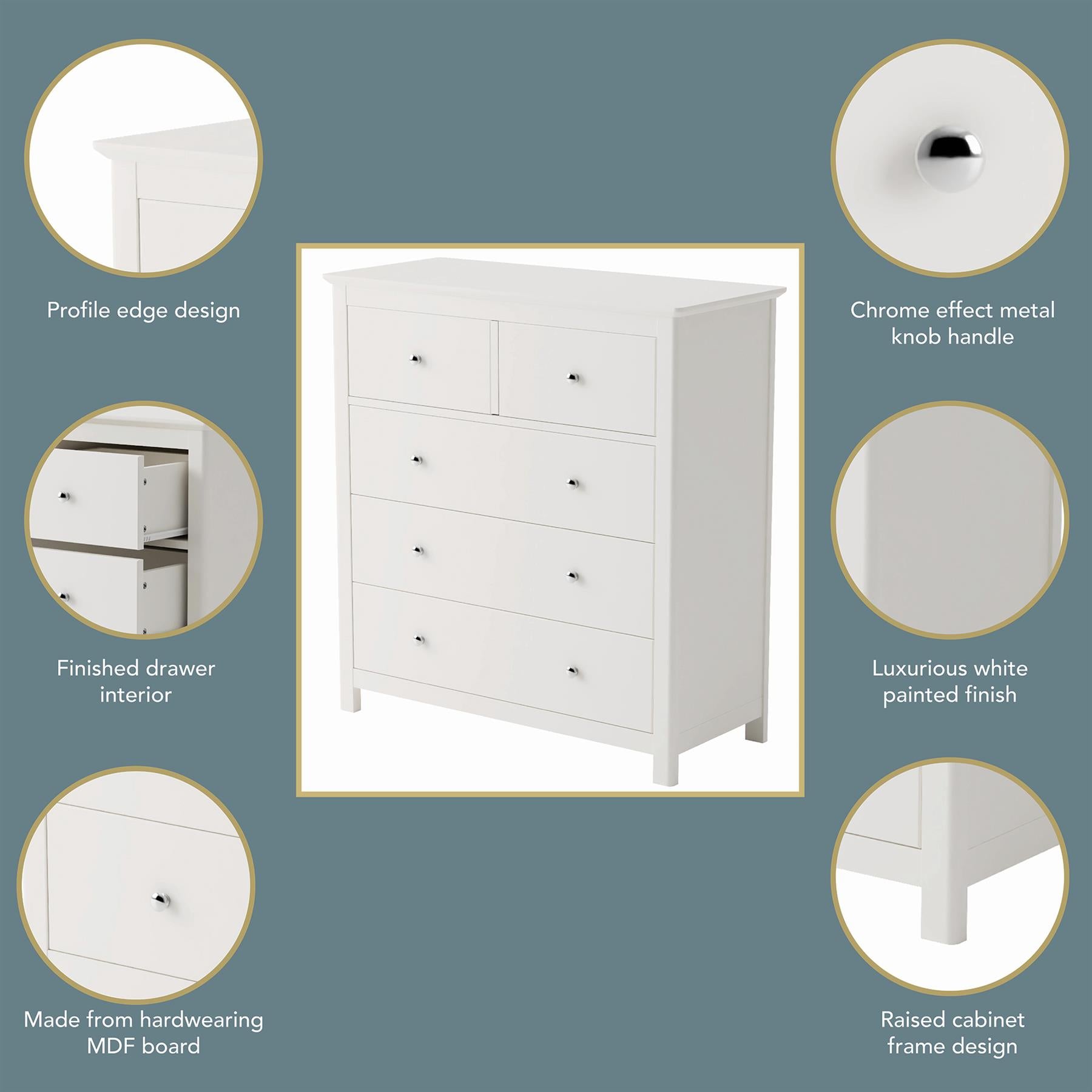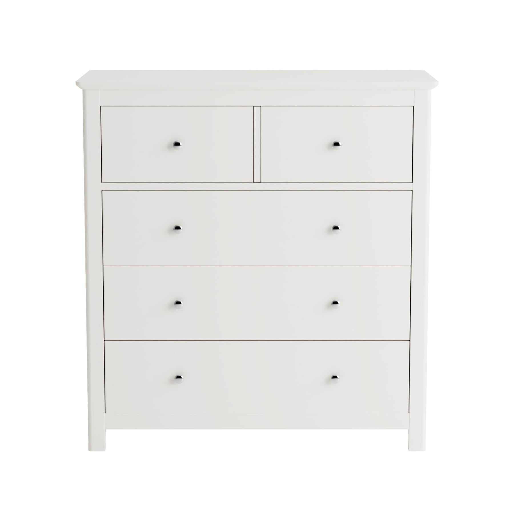 Add a touch of luxury to your bedroom with this stylish Nairn 2 plus 3 drawer chest. Designed to optimise space and yet provide ample storage, there are 2 small drawers at the top, ideal for storing personal effects plus 3 generous full width drawers which provide even more storage for you. The really subtle deep white painted finish emphasises the soft rounded corners of the legs and top, finished off with real metal polished steel effect handles, altogether these features create a calming effect to your bedroom