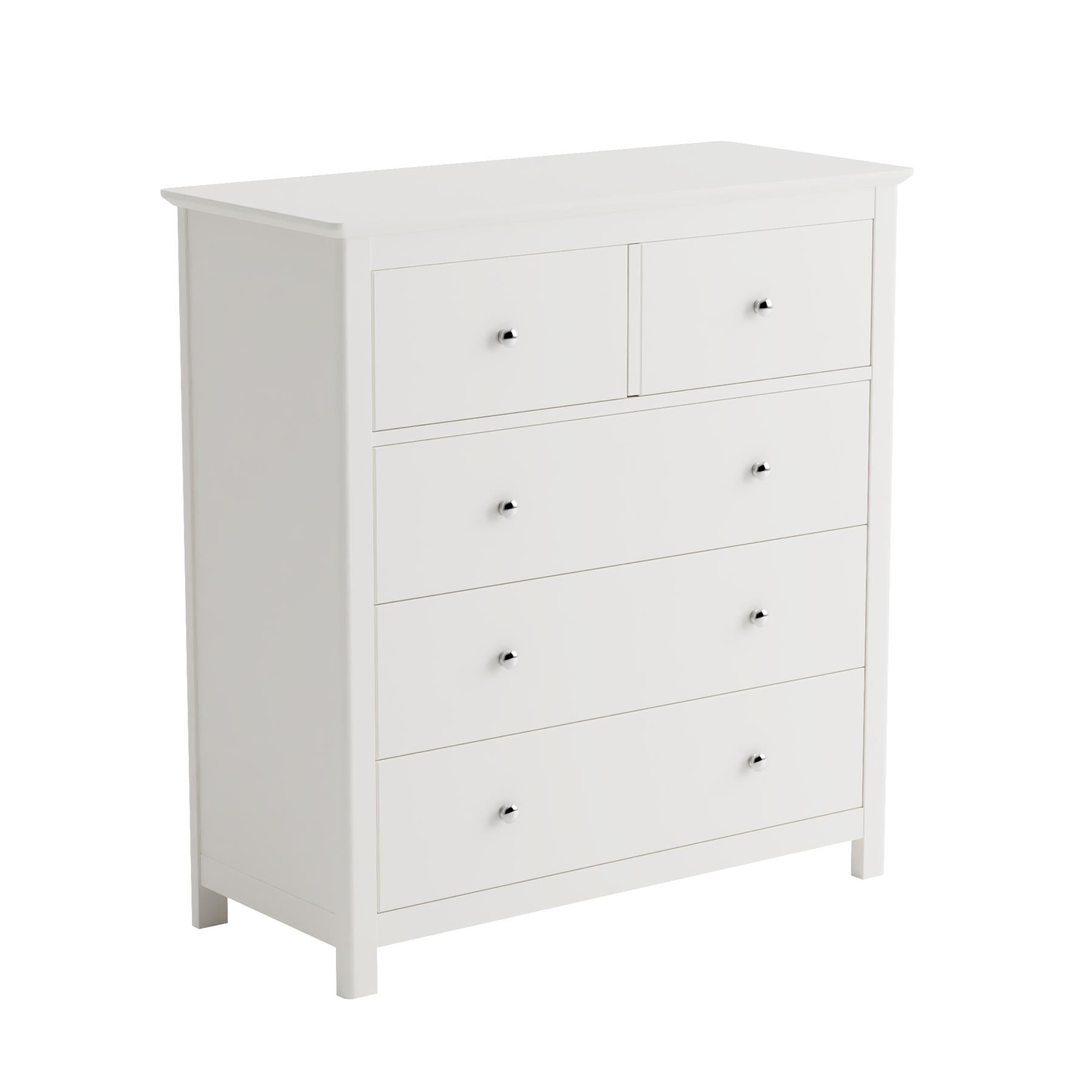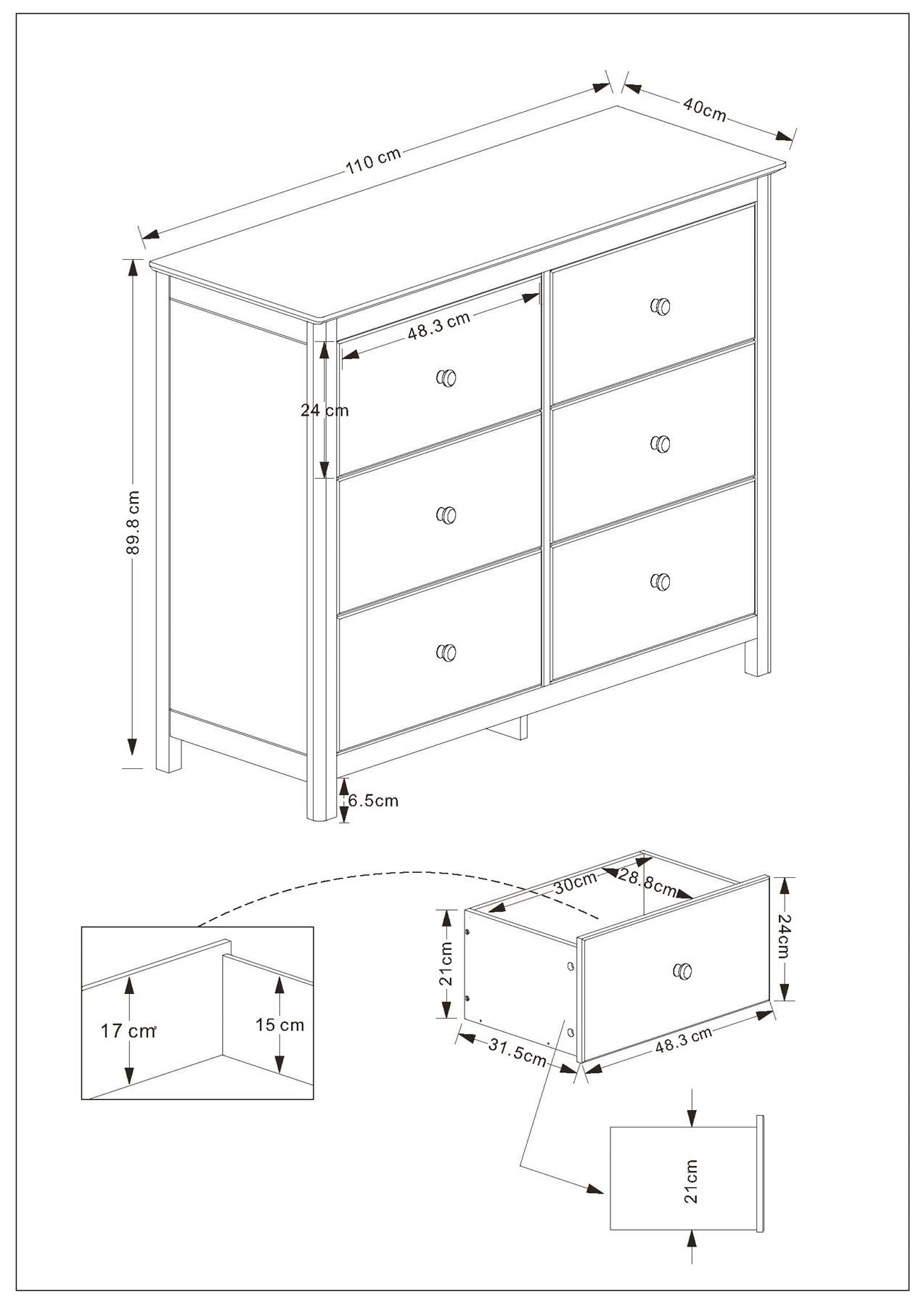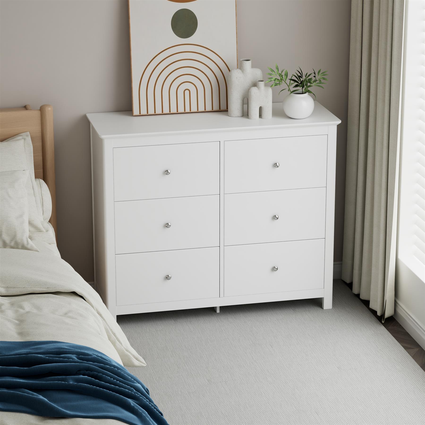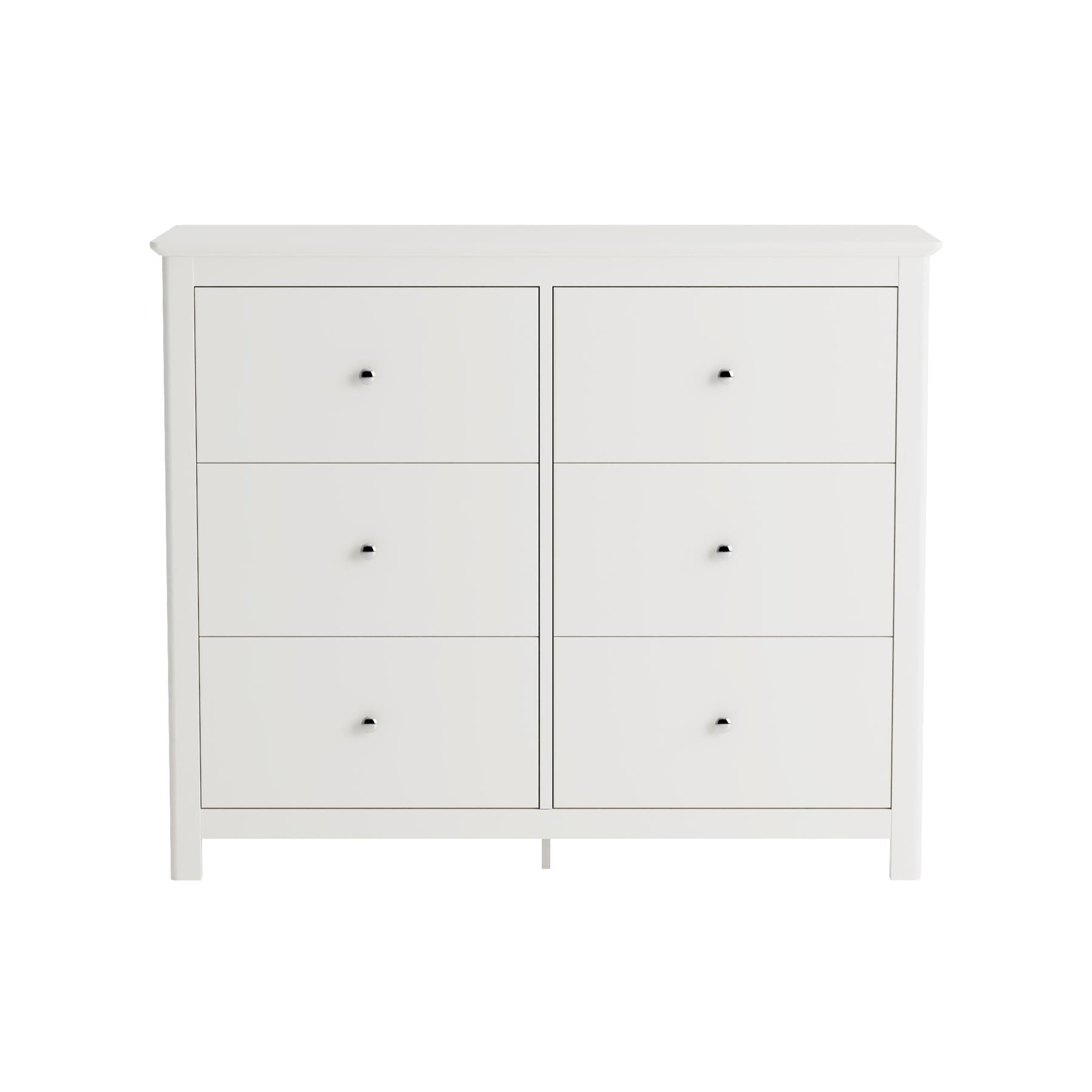 Add a touch of luxury to your bedroom with this stylish Nairn 3 plus 3 drawer double wide chest. Designed to optimise space and yet provide ample storage, there are two rows of 3 generous full width drawers which provide lots more storage for you. There is plenty of room on top for a TV, lamp or pictures and its even ideal for use as a dressing table. The really subtle deep white painted finish emphasises the soft rounded corners of the legs and top, finished off with real metal polished steel effect handles, altogether these features create a calming effect to your bedroom.