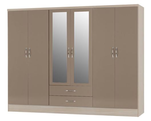 Neptune 6 Door 2 Drawer Mirrored Wardrobe - Oyster Gloss/Light Oak Effect Veneer