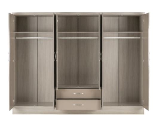 The Neptune 6 Door 2 Drawer Mirrored Wardrobe features a contemporary design owing to the oyster gloss finished front which contrasts perfectly with the light oak veneers. The Neptune has your storage needs covered thanks to the 2 drawers, top shelf and hanging space from the metal rail.
