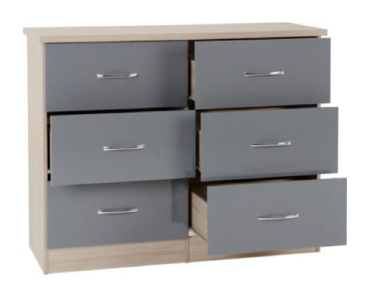 The Nevada 6 Drawer Chest features a contemporary design owing to the grey gloss finished front which contrasts perfectly with the light oak veneers. The Nevada has your storage needs covered thanks to the ample drawer space which sits on sturdy metal runners.