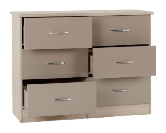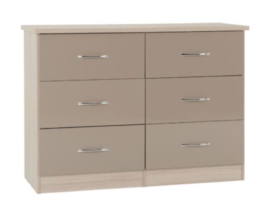 The Nevada Oyster 6 Drawer Chest features a contemporary design owing to the oyster gloss finished front which contrasts perfectly with the light oak veneers. The Nevada has your storage needs covered thanks to the ample drawer space which sits on sturdy metal runners.