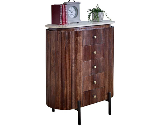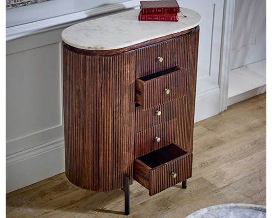Sleek and stylish chest of drawers which will enhance your room and provide storage for things you want out of sight. Featuring 5 drawers and natural marble top this item is built to last and will still look stunning in years to come. Sturdy metal legs complete the look of this item which is completely handmade by our skilled craftsmen in India using eco friendly materials. Made from 100% mango wood and natural marble each piece is individual and unique.