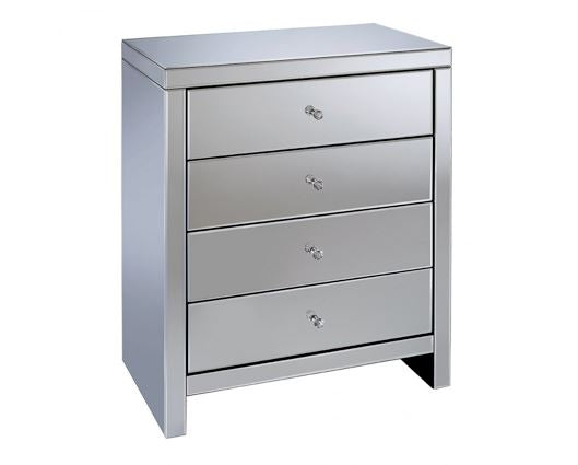 The clean, contemporary and chic Seville range will add a sense of elegance to any home. Constructed from a MDF frame this 4 drawer chest features beautiful bevelled edges along with mock crystal handles. This versatile range will sit comfortably in a modern or traditional setting making this mirrored furniture a welcome addition to any home. This item comes pre-assembled for additional convenience and is part of a complete bedroom collection. Cleaning and Care: Wipe with dry cloth.