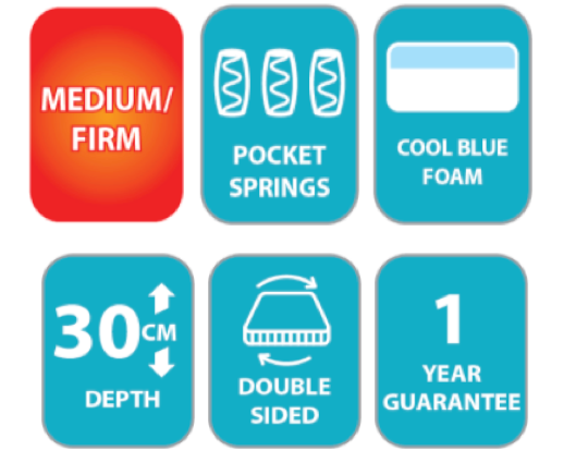 The Seasons Deluxe 1000 Mattress is a mattress built for comfort, with it's pocket springs, hypoallergenic fillings and reflex foam this unique double sided design creates the perfect sleeping environment for those that suffer from temperature regulation issues at night. It also has an incredible cool blue foam topped side that will cool your body down throughout the night so you can guarantee a good nights sleep. Or if you're feeling cold in those winter nights just flip the mattress over and enjoy the warmer and sumptuous density reflex foam and sleep "as snug as a bug'
