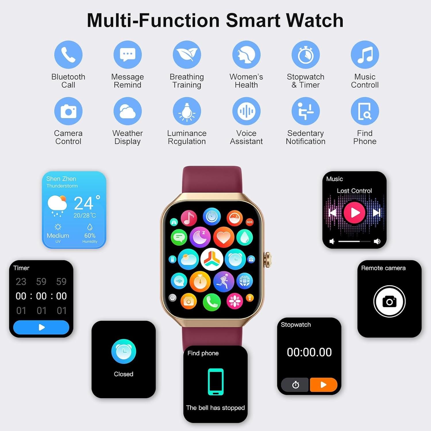 Bluetooth Calling and Smart Notifications: Smart watch with built-in HD microphone and speaker, after connecting to your phone via Bluetooth can receive and make calls directly from your watch, App can store multiple contacts, make you stay in touch with family or friends anytime, anywhere. The smart watch for men can receive message notifications from SMS and social apps (Facebook, Twitter, WhatsApp, Instagram, Messenger, Linkedin, Skype, etc.), so you will never miss any important messages. 1.96 Inch HD Touch Screen and Personalized Dial: The smart watch features a 1.96-inch HD silky smooth touchscreen with clear, smooth graphics and a resolution of 320*386, giving you excellent visual effects, allowing you to clearly and intuitively understand your various data. The smart watch for men has more than 250 exquisite online dials to choose from, and you can change the dial design at any time according to the occasion, mood, and preferences of the day. 24/7 Heart Rate & Sleep Monitor: The smartwatch built-in high-performance optical sensor that can monitor our heart rate in real-time 24 hours a day, and you can better understand your heart rate trends. Also, the womens watch automatically monitors your sleep status (deep sleep, light sleep, waking up), provides a comprehensive sleep quality analysis, so better sleep starts now. (Data is for reference only and not for medical purposes) 113+ Sports Modes and IP68 Waterproof: This fitness smart watch supports 113+ sports modes such as walking, running, cycling, and soccer, and you can visually read sports data (steps, distance, calories, etc.) on the smart watch. To help you train scientifically and achieve your fitness goals. The running smart watch is IP68 waterproof and can be worn when washing hands, or in the rain, it is not recommended for use in hot water or seawater. More Practical Functions and Wide Compatibility: Smart watch has many practical features, such as alarm clock, stopwatch, timer, camera control, find your phone, calculator, music control, weather forecast, sedentary reminder, calendar, brightness adjustment, female menstrual cycle tracker, breath training, etc. Smart watch for women is compatible with smartphones (Android 9.0, iOS 10.0, and above), not desktop computers, laptops, and tablets.