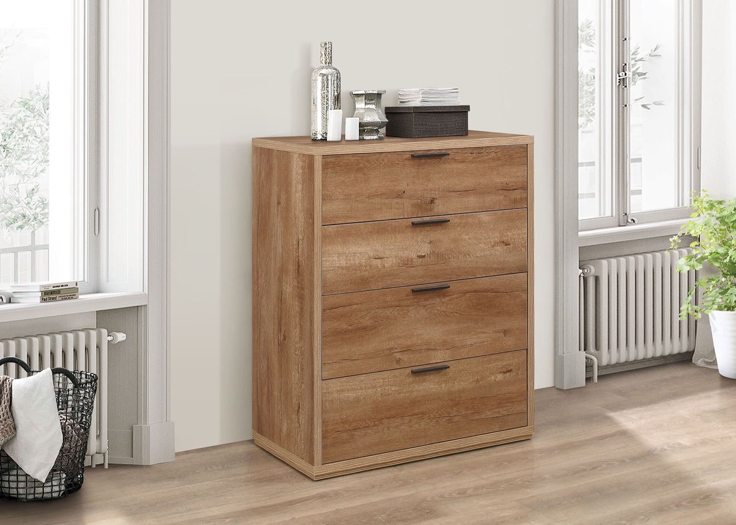 The Stockwell range provides a touch of reclaimed design to any home. It's rustic oak effect finish and sleek black handles create a truly rustic looking range. Providing an ample amount of storage space this Stockwell 4 drawer chest will truly enhance any bedroom. It's simple to achieve a traditional farmhouse feel with items from the Stockwell range. It's a style so classic that it would work as well in a city flat as it would in a cosy cottage. Care instructions: Wipe carefully with a soft, dry cloth.