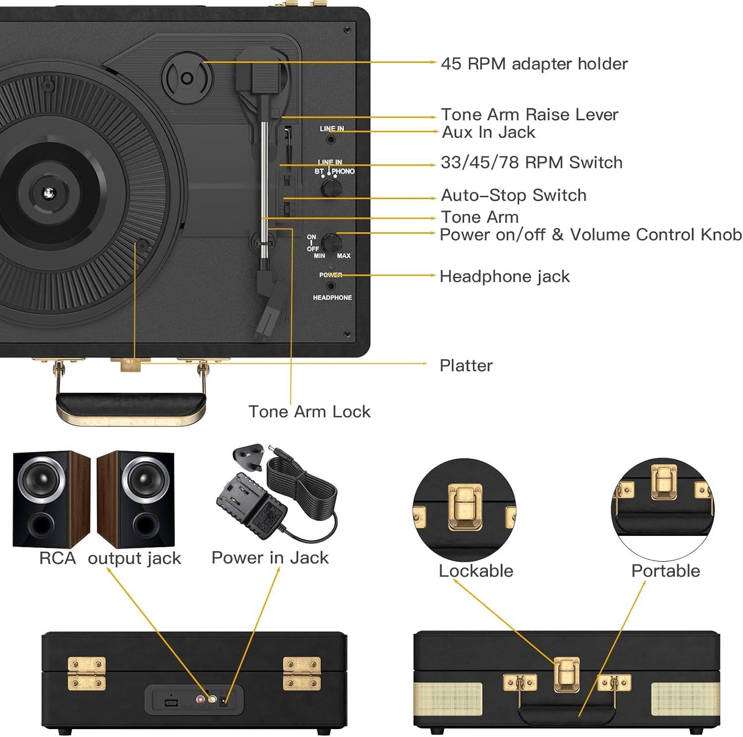 Brown classic Waxed leather look with retro metal screws and meshes. The combination of classic aesthetics and contemporary design makes it an ideal choice for beginners who are passionate about vinyl record player. This three speed (33 1/3, 45, 78 RPM) portable turntable features upgraded premium sound quality. Also supports 3 sizes of 7/10/12 inch vinyl records. Music playback through turntable's built-in Bluetooth speakers. Connect external speakers via the RCA output. The Aux-In line is used for devices such as MP3 and smartphones. For personal listening, connect your headphones to the headphone jack.