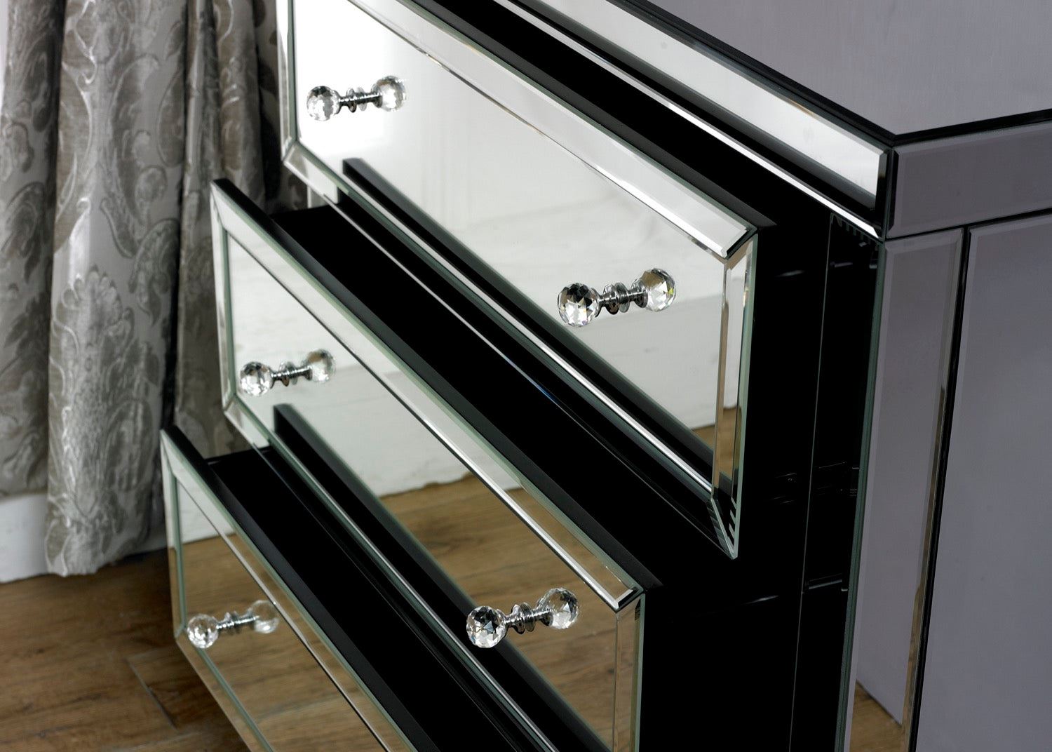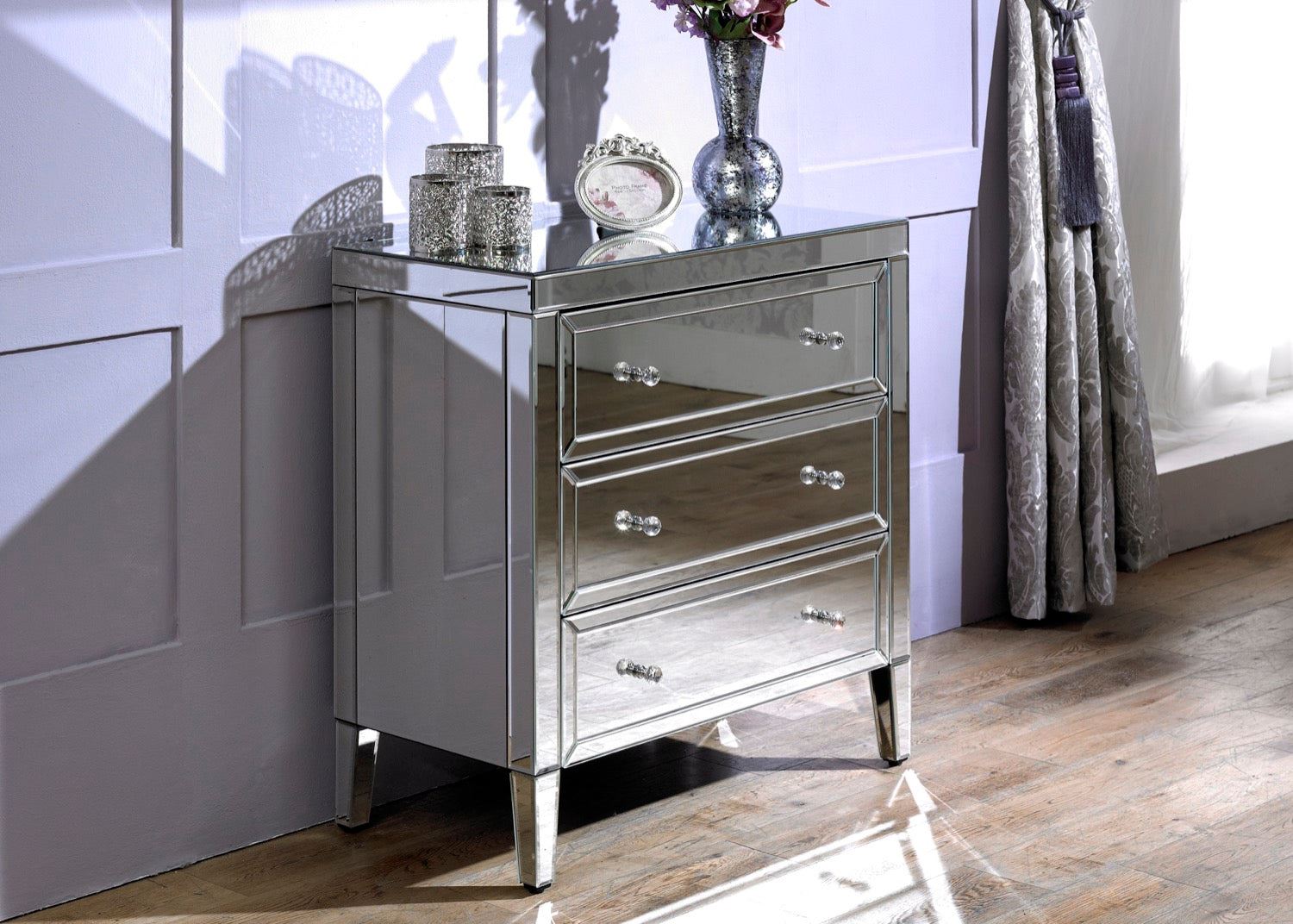 The beautiful and glamorous Valencia 3 drawer chest will be a stylish addition to any bedroom. Constructed from a MDF frame this stunning range features a mirrored finish with bevelled edges and elegant mock crystal handles. This item comes pre-assembled for additional convenience and is part of a complete bedroom collection. Cleaning and Care: Wipe with dry cloth