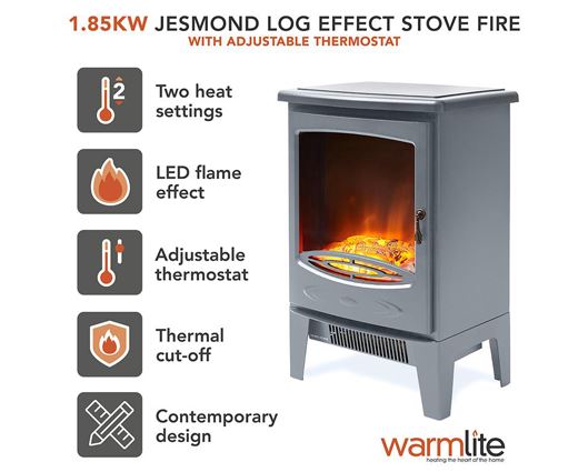 Create a cosy and intimate atmosphere with the Warmlite Jesmond 1.85KW Log Fire Stove, designed to keep you warm without the hassle of a real log fire. Choose from two optional heat settings of 950W and 1850W for maximum comfort to wind down after a long day. The realistic flame design can be enjoyed as a cosy visual effect even when you don't need warming up - perfect for entertaining with friends and family. Whether you feel the cold or you're more warm-blooded, we've made it easier than ever to control the temperature of your room. Simply set to your desired temperature and this will be maintained using the built-in thermostat. The thermal cut-off device prevents overheating so you'll always have peace of mind when keeping your home warm. Crafted with a grey cast effect finish for the look and feel of an authentic fireplace, to complete the modern aesthetic in your home.