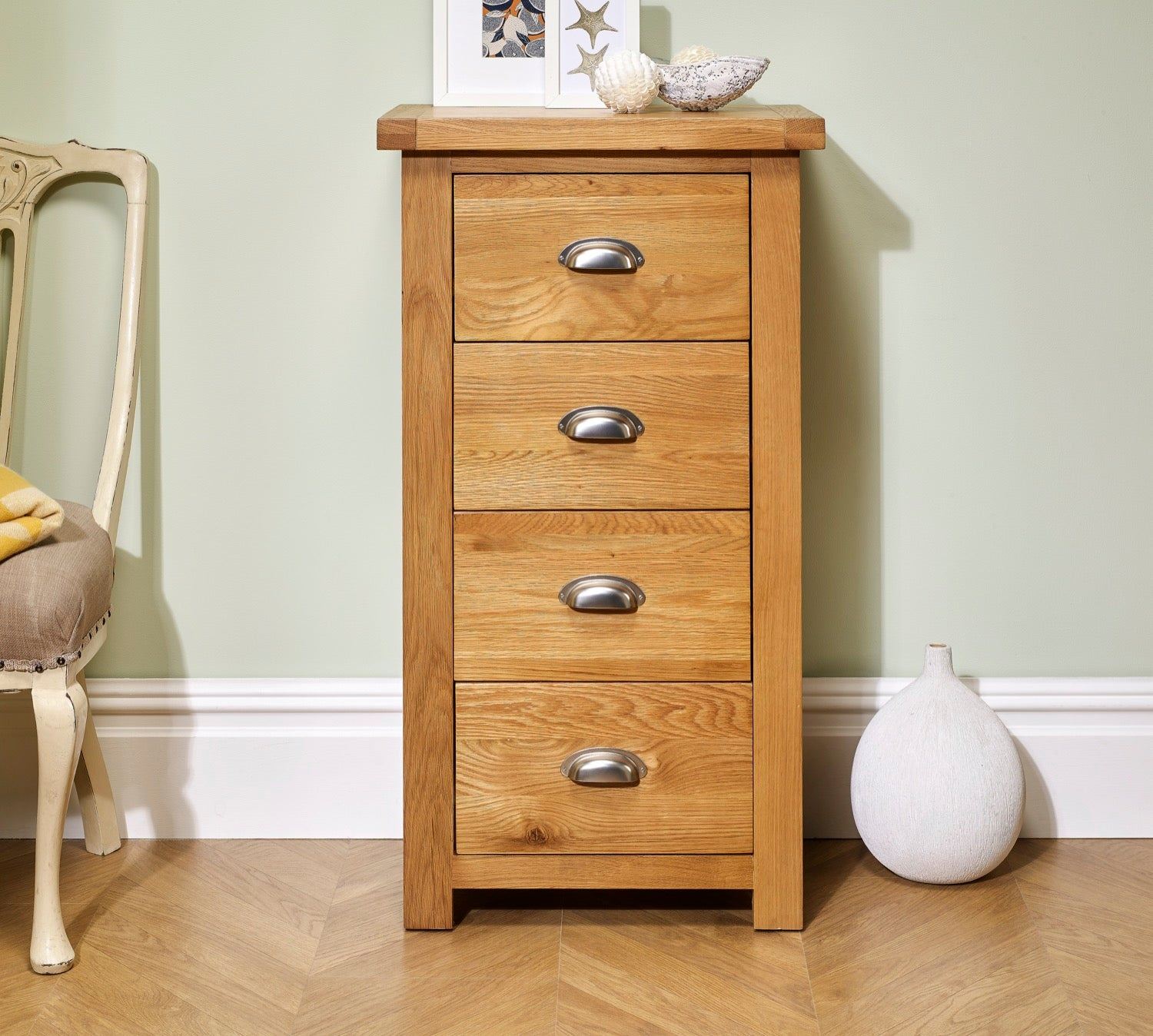 This Chunky, solid oak range highlights the prominent grain of the wood creating a rustic feel. Providing cup style handles creating versatility within its style, the Woburn range is suitable for a wide range of interior schemes. Featuring 4 drawers providing plenty of storage, this narrow chest has a tall design to take up less floor space than your average piece of furniture. Why not re-style your bedroom today!