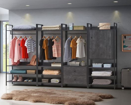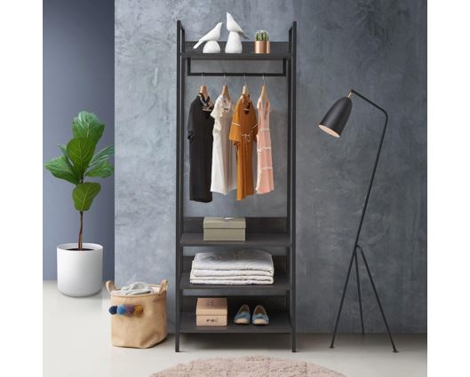 The Zulu range of bedroom furniture boasts stunning contemporary looks, in black with metal framework, and featuring versatile modular design. This 4 piece set includes drawer and cabinet storage, along with shelves and rail hanging, offering you the complete storage solution for the modern bedroom or apartment. A beautiful synthesis of form and function, the Zulu range is manufactured from sturdy engineered board in black finish.